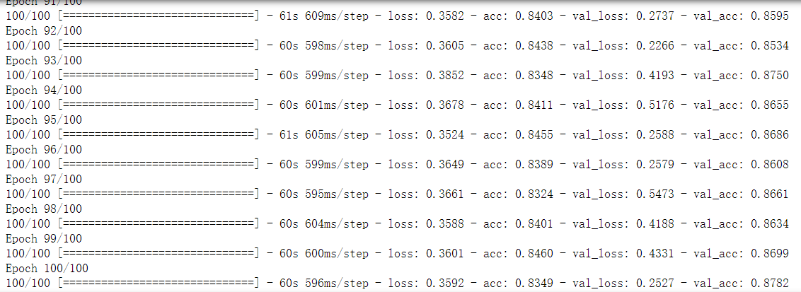 可以看出训练集精度(acc):0.8349 验证集精度(val_acc):0.8782