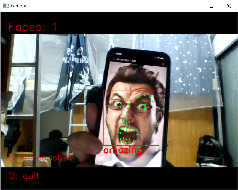 1 import dlib # 人脸识别的库dlib 2 import numpy as np # 数据处理的库numpy 3 import cv2 # 图像处理的库OpenCv 4 5 6 class face_emotion(): 7 def __init__(self): 8 # 使用特征提取器get_frontal_face_detector 9 self.detector = dlib.get_frontal_face_detector() 10 # dlib的68点模型,使用作者训练好的特征预测器 下载地址 http://dlib.net/files/ 11 self.predictor = dlib.shape_predictor("shape_predictor_68_face_landmarks.dat") 12 13 # 建cv2摄像头对象,这里使用电脑自带摄像头,如果接了外部摄像头,则自动切换到外部摄像头 14 self.cap = cv2.VideoCapture(0) 15 # 设置视频参数,propId设置的视频参数,value设置的参数值 16 self.cap.set(3, 480) 17 # 截图screenshoot的计数器 18 self.cnt = 0 19 20 def learning_face(self): 21 22 # 眉毛直线拟合数据缓冲 23 line_brow_x = [] 24 line_brow_y = [] 25 26 # cap.isOpened() 返回true/false 检查初始化是否成功 27 while (self.cap.isOpened()): 28 29 # cap.read() 30 # 返回两个值: 31 # 一个布尔值true/false,用来判断读取视频是否成功/是否到视频末尾 32 # 图像对象,图像的三维矩阵 33 flag, im_rd = self.cap.read() 34 35 # 每帧数据延时1ms,延时为0读取的是静态帧 36 k = cv2.waitKey(1) 37 38 # 取灰度 39 img_gray = cv2.cvtColor(im_rd, cv2.COLOR_RGB2GRAY) 40 41 # 使用人脸检测器检测每一帧图像中的人脸。并返回人脸数rects 42 faces = self.detector(img_gray, 0) 43 44 # 待会要显示在屏幕上的字体 45 font = cv2.FONT_HERSHEY_SIMPLEX 46 47 # 如果检测到人脸 48 if (len(faces) != 0): 49 50 # 对每个人脸都标出68个特征点 51 for i in range(len(faces)): 52 # enumerate方法同时返回数据对象的索引和数据,k为索引,d为faces中的对象 53 for k, d in enumerate(faces): 54 # 用红色矩形框出人脸 55 cv2.rectangle(im_rd, (d.left(), d.top()), (d.right(), d.bottom()), (0, 0, 255)) 56 # 计算人脸热别框边长 57 self.face_width = d.right() - d.left() 58 59 # 使用预测器得到68点数据的坐标 60 shape = self.predictor(im_rd, d) 61 # 圆圈显示每个特征点 62 for i in range(68): 63 cv2.circle(im_rd, (shape.part(i).x, shape.part(i).y), 2, (0, 255, 0), -1, 8) 64 # cv2.putText(im_rd, str(i), (shape.part(i).x, shape.part(i).y), cv2.FONT_HERSHEY_SIMPLEX, 0.5, 65 # (255, 255, 255)) 66 67 # 分析任意n点的位置关系来作为表情识别的依据 68 mouth_width = (shape.part(54).x - shape.part(48).x) / self.face_width # 嘴巴咧开程度 69 mouth_higth = (shape.part(66).y - shape.part(62).y) / self.face_width # 嘴巴张开程度 70 # print("嘴巴宽度与识别框宽度之比:",mouth_width_arv) 71 # print("嘴巴高度与识别框高度之比:",mouth_higth_arv) 72 73 # 通过两个眉毛上的10个特征点,分析挑眉程度和皱眉程度 74 brow_sum = 0 # 高度之和 75 frown_sum = 0 # 两边眉毛距离之和 76 for j in range(17, 21): 77 brow_sum += (shape.part(j).y - d.top()) + (shape.part(j + 5).y - d.top()) 78 frown_sum += shape.part(j + 5).x - shape.part(j).x 79 line_brow_x.append(shape.part(j).x) 80 line_brow_y.append(shape.part(j).y) 81 82 # self.brow_k, self.brow_d = self.fit_slr(line_brow_x, line_brow_y) # 计算眉毛的倾斜程度 83 tempx = np.array(line_brow_x) 84 tempy = np.array(line_brow_y) 85 z1 = np.polyfit(tempx, tempy, 1) # 拟合成一次直线 86 self.brow_k = -round(z1[0], 3) # 拟合出曲线的斜率和实际眉毛的倾斜方向是相反的 87 88 brow_hight = (brow_sum / 10) / self.face_width # 眉毛高度占比 89 brow_width = (frown_sum / 5) / self.face_width # 眉毛距离占比 90 # print("眉毛高度与识别框高度之比:",round(brow_arv/self.face_width,3)) 91 # print("眉毛间距与识别框高度之比:",round(frown_arv/self.face_width,3)) 92 93 # 眼睛睁开程度 94 eye_sum = (shape.part(41).y - shape.part(37).y + shape.part(40).y - shape.part(38).y + 95 shape.part(47).y - shape.part(43).y + shape.part(46).y - shape.part(44).y) 96 eye_hight = (eye_sum / 4) / self.face_width 97 # print("眼睛睁开距离与识别框高度之比:",round(eye_open/self.face_width,3)) 98 99 # 分情况讨论 100 # 张嘴,可能是开心或者惊讶 101 if round(mouth_higth >= 0.03): 102 if eye_hight >= 0.056: 103 cv2.putText(im_rd, "amazing", (d.left(), d.bottom() + 20), cv2.FONT_HERSHEY_SIMPLEX, 104 0.8, 105 (0, 0, 255), 2, 4) 106 else: 107 cv2.putText(im_rd, "happy", (d.left(), d.bottom() + 20), cv2.FONT_HERSHEY_SIMPLEX, 0.8, 108 (0, 0, 255), 2, 4) 109 110 # 没有张嘴,可能是正常和生气 111 else: 112 if self.brow_k <= -0.3: 113 cv2.putText(im_rd, "angry", (d.left(), d.bottom() + 20), cv2.FONT_HERSHEY_SIMPLEX, 0.8, 114 (0, 0, 255), 2, 4) 115 else: 116 cv2.putText(im_rd, "nature", (d.left(), d.bottom() + 20), cv2.FONT_HERSHEY_SIMPLEX, 0.8, 117 (0, 0, 255), 2, 4) 118 119 # 标出人脸数 120 cv2.putText(im_rd, "Faces: " + str(len(faces)), (20, 50), font, 1, (0, 0, 255), 1, cv2.LINE_AA) 121 else: 122 # 没有检测到人脸 123 cv2.putText(im_rd, "No Face", (20, 50), font, 1, (0, 0, 255), 1, cv2.LINE_AA) 124 125 # 添加说明 126 im_rd = cv2.putText(im_rd, "S: screenshot", (20, 400), font, 0.8, (0, 0, 255), 1, cv2.LINE_AA) 127 im_rd = cv2.putText(im_rd, "Q: quit", (20, 450), font, 0.8, (0, 0, 255), 1, cv2.LINE_AA) 128 129 # 按下s键截图保存 130 if (k == ord('s')): 131 self.cnt += 1 132 cv2.imwrite("screenshoot" + str(self.cnt) + ".jpg", im_rd) 133 134 # 按下q键退出 135 if (k == ord('q')): 136 break 137 138 # 窗口显示 139 cv2.imshow("camera", im_rd) 140 141 # 释放摄像头 142 self.cap.release() 143 144 # 删除建立的窗口 145 cv2.destroyAllWindows() 146 147 148 if __name__ == "__main__": 149 my_face = face_emotion() 150 my_face.learning_face()