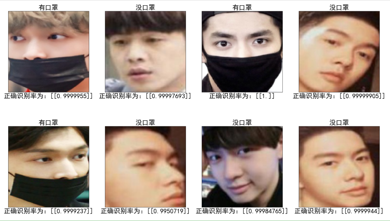 1 #进行口罩识别判断 2 from keras.models import load_model 3 import matplotlib.pyplot as plt 4 from PIL import Image 5 from keras.preprocessing import image 6 # 设置中文 7 plt.rcParams['font.family'] = ['SimHei'] 8 # 设置子图 9 figure,ax = plt.subplots(nrows=2, ncols=4, sharex=True, sharey=True,figsize=(24,14)) 10 # 导入训练模型 11 model = load_model('mask_and_unmask_100epoch.h5') 12 13 # 图片处理,图片的大小改为150*150 14 def convertjpg(jpgfile): 15 img=Image.open(jpgfile) 16 try: 17 new_img=img.resize((150,150),Image.BILINEAR) 18 return new_img 19 except Exception as e: 20 print(e) 21 22 # 用循环取出test中的图片进行预测 23 for i in range(1,9): # 选择要测试图片的数量 24 img = str(i)+'.jpg' 25 img_show = convertjpg(test_dir + img) 26 img_scale = image.img_to_array(img_show) # 将图片转为数组(150,150,3) 27 img_scale = img_scale.reshape(1,150,150,3) # 将形状转化为(1,150,150,3) 28 img_scale = img_scale.astype('float32')/255 # 归一化 29 30 result = model.predict(img_scale)# 预测函数 31 32 # 判断是猫还是狗 33 if result>0.5: 34 title = '没口罩' 35 label = '正确识别率为:'+str(result) 36 else: 37 title = '有口罩' 38 label = '正确识别率为:'+str(1-result) 39 40 ax = ax.flatten() # 将子图从多维变成一维 41 ax[i-1].imshow(img_show, cmap='Greys', interpolation='nearest') 42 # 子图标题 43 ax[i-1].set_title(title,fontsize=24) 44 # 子图X轴标签 45 ax[i-1].set_xlabel(label,fontsize=24) 46 # 去掉刻度 47 ax[0].set_xticks([]) 48 ax[0].set_yticks([]) 49 plt.show()