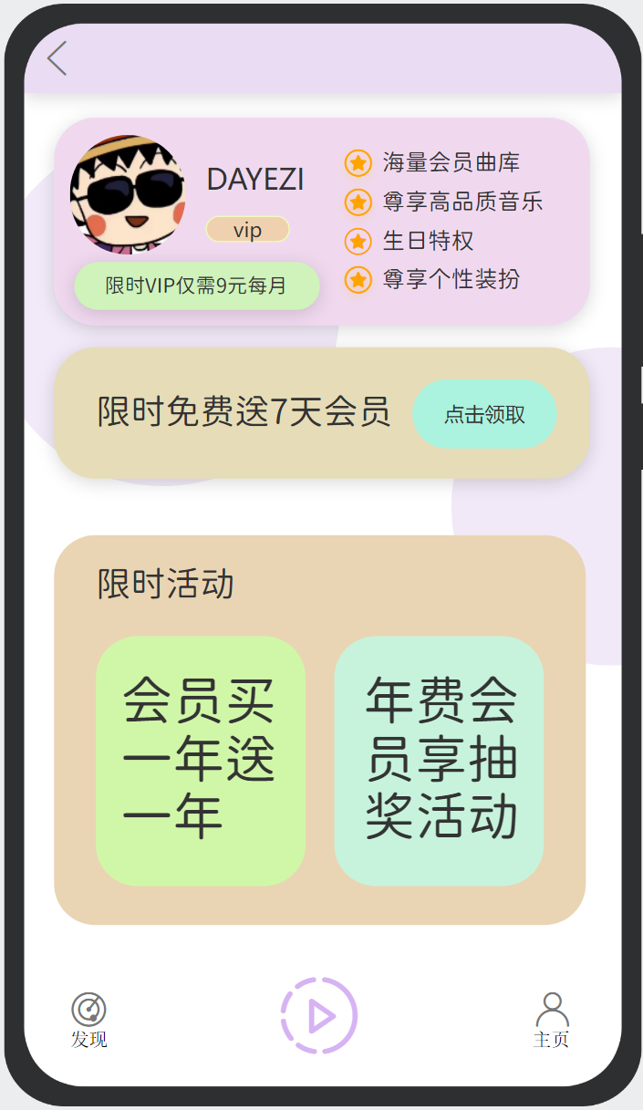首先进入主页面。点击歌手姓名可以进入歌手主页,查看歌手信息和听歌手所唱的更多歌曲。 点击主页歌曲名字旁边给三个点进入歌单界面,查看我的歌单,并且可以在歌单界面对歌单内的歌进行增加和删除。 在主页面点击消息按钮旁的VIP按钮,进入VIP界面,可以在此界面查看个人VIP信息、领取VIP和购买VIP。 点击主页面的评论按钮,可以查看评论和发表评论。点击主页面的分享按钮可以对当前歌曲进行分享。每个页面都提供返回按钮,可以切换到上一层界面。