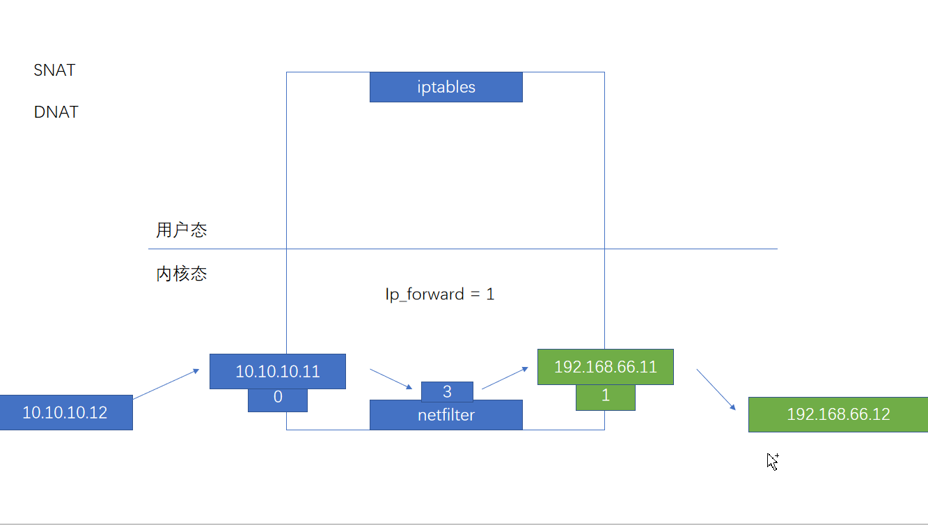 若没有开启防火墙,数据报文经过10.11的网卡,开启路由转发发送到66.11的网卡,通过后 发送到客户端 若开启了防火墙,则数据报文先经过10.11网卡,在经过开启nerfilter的端口过滤,在被转发 到66.11的网卡,最后发送到客户端。