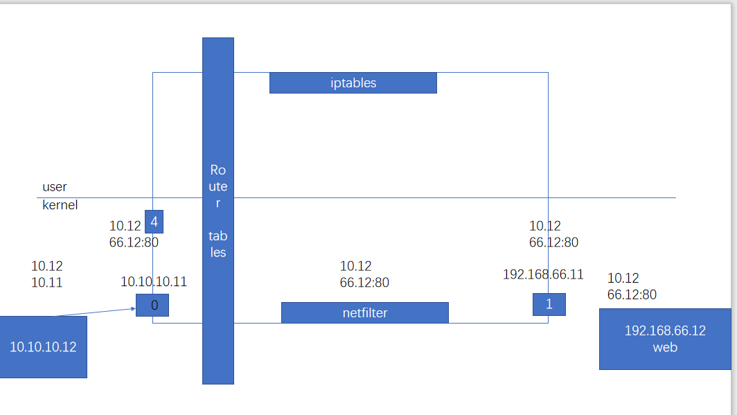 客户端发送数据报文到eth0,在路由表之前的端口进行转换修改器目标地址,经过 netfiltre的端口发送至eth1,在发送到web服务器