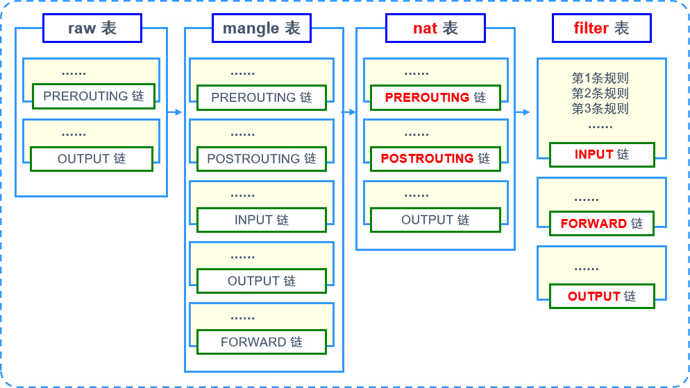 数据报文一次经过raw表、mangle表、nat表的PREROUTING,而后进入路由表,路由表进 行匹配,匹配成功,经过mangle表、filter表的FORWARD,在经过 mangle表、nat表的 POSTROUTING,数据报文成功转发。