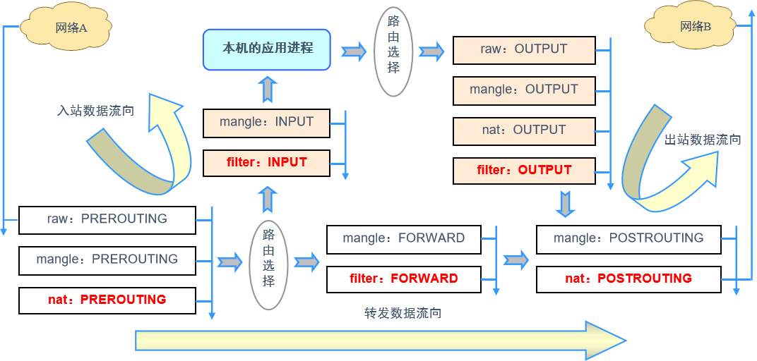 # 入站:(网络A发送数据报文到本机应用程序)PREROUTING > INPUT