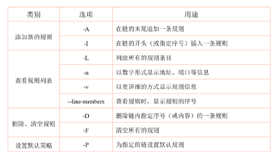 # iptables [-t 表名] 选项 [链名] [条件] [-j 控制类型]