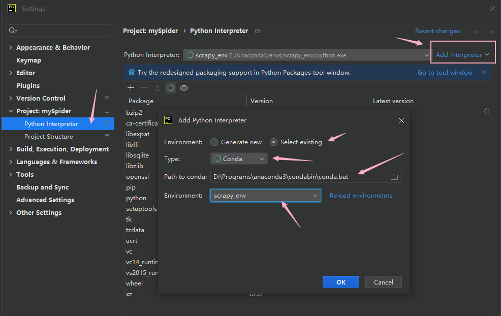 添加虚拟环境,选择已存在的,anaconda的path是安装目录下的\anaconda3\condabin\conda.bat