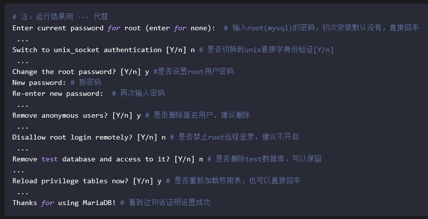 运行安全初始化脚本来增强 MariaDB 的安全性,该脚本会提示你设置 root 用户密码、删除匿名用户、禁止 root 远程登录等。在终端执行以下命令:
