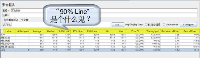 90%用户请求响应时间,如果把某次任务的所有请求的响应时间按从小到大排序,它是指排在90%处那个点的请求的响应时间,也就是说有90%的请求的响应时间小于等于这个响应时间。后面的50/60/70/80/90/95/99 % Line 也是类似的含义。