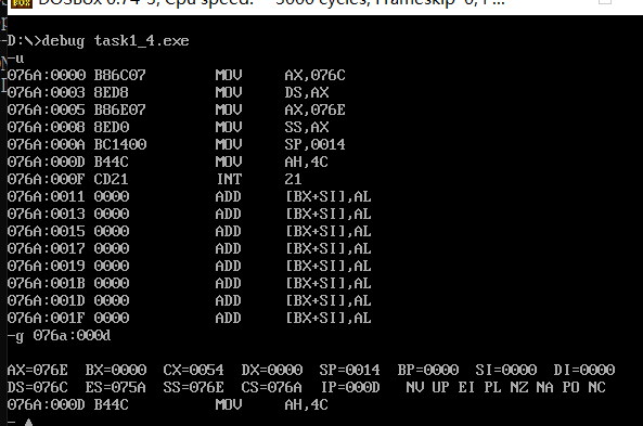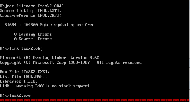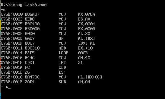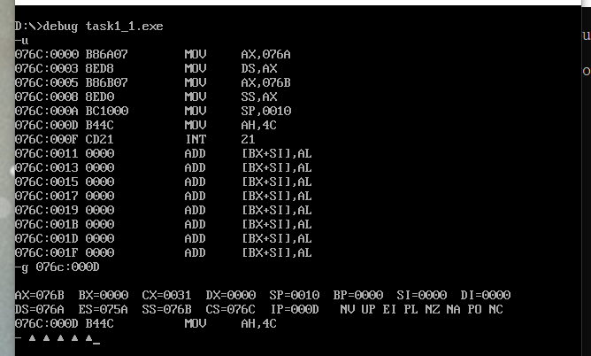assume ds:data, cs:code, ss:stack code segment start: mov ax, data mov ds, ax mov ax, stack mov ss, ax mov sp, 20 mov ah, 4ch int 21h code ends data segment db 20 dup(0) data ends stack segment db 20 dup(0) stack ends end start