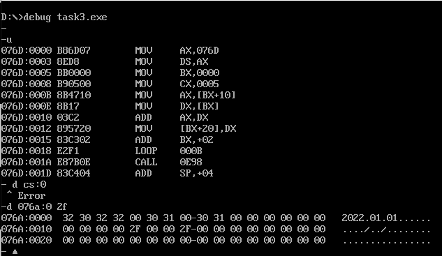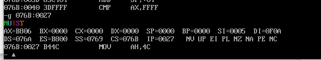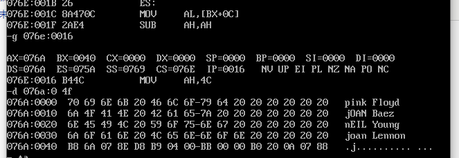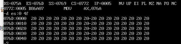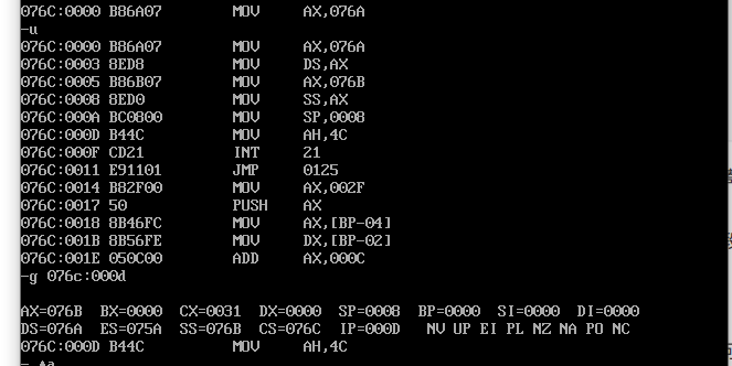 ① 在debug中将执行到line17结束、line19之前,记录此时:寄存器(DS) = ___076A_, 寄存器(SS) = _076B___, 寄存器(CS) = __076C__
