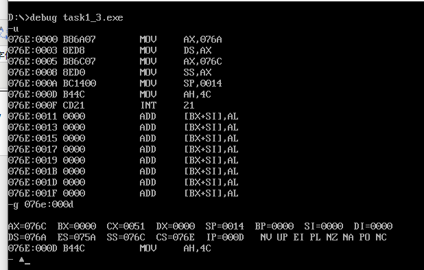 task1_4.asm仍然可以正确执行, 前三个不行. end指令除了声明程序结束,它还指明了程序的入口地址, task1_4.asm若不指明程序入口地址, 依旧是从start开始(程序段区域), 而前三个