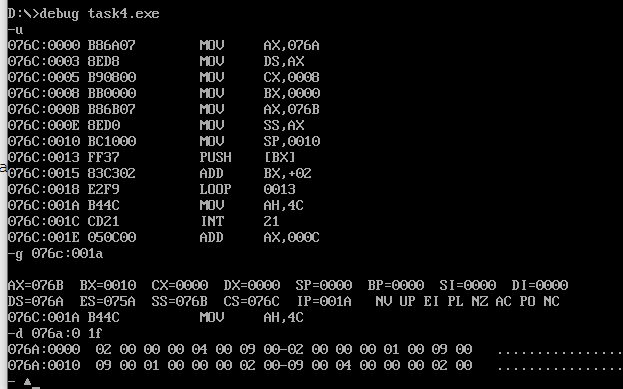 assume cs:code data1 segment dw 2, 0, 4, 9, 2, 0, 1, 9 data1 ends data2 segment dw 8 dup(0) data2 ends code segment start: mov ax,data1 mov ds,ax mov cx,8 mov bx,0 mov ax,data2 mov ss,ax mov sp,10h s: push word ptr [bx] add bx,2 loop s mov ah, 4ch int 21h code ends end start