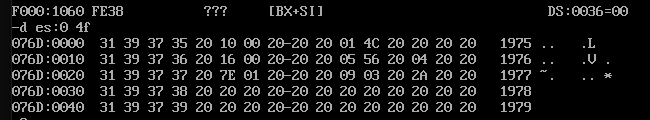 assume cs:code, ds:data, es:table data segment db '1975', '1976', '1977', '1978', '1979' dw 16, 22, 382, 1356, 2390 dw 3, 7, 9, 13, 28 data ends table segment db 5 dup( 16 dup(' ') ) ; table ends code segment start: mov ax,table mov es,ax mov ax,data mov ds,ax mov cx,5 mov bx,0 mov si,0 s: mov ax,ds:[bx] mov es:[si],ax mov ax,ds:[bx+2] mov es:[si+2],ax add bx,4 add si,16 loop s mov cx,5 mov si,0 mov bx,0 s1: mov ax,ds:[bx+20] mov es:[si+5],ax mov ax,ds:[bx+25] mov es:[si+10],ax add si,16 add bx,2 mov ax,ds:[bx+20] div byte ptr ds:[bx+25] mov es:[si+13],al loop s1 code ends end start