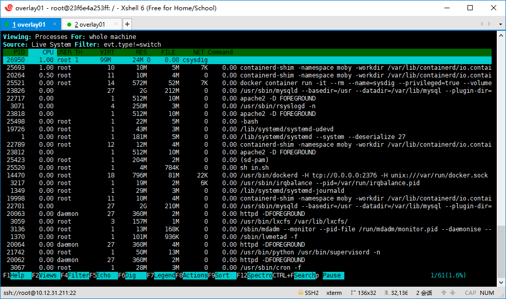 使用命令 docker exec -it sysdig bash 进入容器,执行 csysdig 命令,以交互方式启动 sysdig