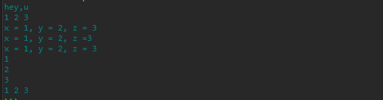 print('hey,u') x,y,z = 1,2,3 print(x, y, z) print('x = %d, y = %d, z = %d' %(x,y,z)) print('x = {}, y = {}, z ={}'.format(x,y,z)) print(f'x = {x}, y = {y}, z = {z}') print(x) print(y) print(z) print(x, end=' ') print(y, end=' ') print(z)