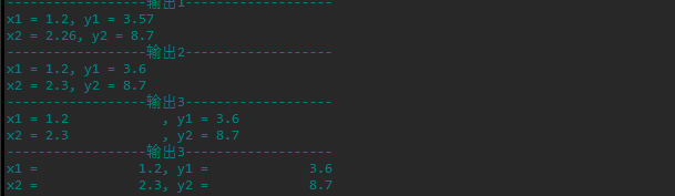 x1, y1 = 1.2, 3.57 x2, y2 = 2.26, 8.7 print('{:-^40}'.format('输出1')) print('x1 = {}, y1 = {}'.format(x1, y1)) print('x2 = {}, y2 = {}'.format(x2, y2)) print('{:-^40}'.format('输出2')) print('x1 = {:.1f}, y1 = {:.1f}'.format(x1, y1)) print('x2 = {:.1f}, y2 = {:.1f}'.format(x2, y2)) print('{:-^40}'.format('输出3')) print('x1 = {:<15.1f}, y1 = {:<15.1f}'.format(x1, y1)) print('x2 = {:<15.1f}, y2 = {:<15.1f}'.format(x2, y2)) print('{:-^40}'.format('输出3')) print('x1 = {:>15.1f}, y1 = {:>15.1f}'.format(x1, y1)) print('x2 = {:>15.1f}, y2 = {:>15.1f}'.format(x2, y2))
