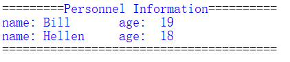 name1, age1 = 'Bill', 19 name2, age2 = 'Hellen', 18 title = 'Personnel Information' print(f'{title:=^40}') print(f'name: {name1:10} age: {age1:3}') print(f'name: {name2:10} age: {age2:3}') print(40*'=')
