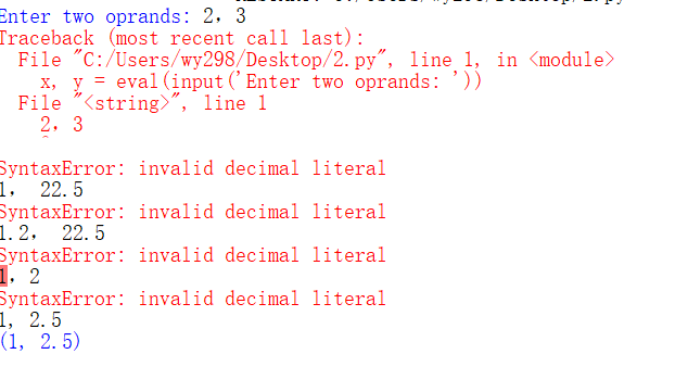 x, y = eval(input('Enter two oprands: ')) ans = x + y print(f'{x} + {y} = {ans}') print(f'{type(x)} + {type(y)} = {type(ans)}')