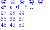 print(chr(0x1f600), end = " ") print(chr(0x1f601), end = " ") print(chr(0x1f602), end = " ") print(chr(0x1f603), end = " ") print(chr(0x1f604)) print(chr(10000), end=" ") print(chr(0x025b), end=" ") print(chr(0x2708), end=" ") print(chr(0x00A5), end=" ") print(chr(0x266b)) print(ord('a'), end = " ") print(ord('b'), end = " ") print(ord('c')) print(ord('A'), end = " ") print(ord('B'), end = " ") print(ord('C')) print(ord('0'), end = " ") print(ord('1'), end = " ") print(ord('2'))