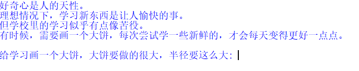 import math text = ''' 好奇心是人的天性。 理想情况下,学习新东西是让人愉快的事。 但学校里的学习似乎有点像苦役。 有时候,需要画一个大饼,每次尝试学一些新鲜的,才会每天变得更好一点点。 ''' print(text) r = float(input('给学习画一个大饼,大饼要做的很大,半径要这么大: ')) circle = 2*math.pi*r print(f'绕起来,大饼的圆周有这么长, {circle}, 够不够激发你探索未知的动力...')
