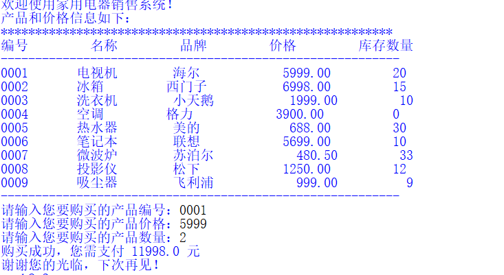print('task8_1.py') ''' 家用电器销售系统 v1.0 ''' print('欢迎使用家用电器销售系统!') print('产品和价格信息如下:') print('*'*57) print('%-10s'%'编号', '%-10s'%'名称', '%-10s'%'品牌', '%-10s'%'价格', '%-10s'%'库存数量') print('-'*58) print('%-10s'%'0001', '%-10s'%'电视机', '%-10s'%'海尔', '%10.2f'%5999.00, '%10d'%20) print('%-10s'%'0002', '%-10s'%'冰箱', '%-10s'%'西门子', '%10.2f'%6998.00, '%10d'%15) print('%-10s'%'0003', '%-10s'%'洗衣机', '%-10s'%'小天鹅', '%10.2f'%1999.00, '%10d'%10) print('%-10s'%'0004', '%-10s'%'空调', '%-10s'%'格力', '%10.2f'%3900.00, '%10d'%0) print('%-10s'%'0005', '%-10s'%'热水器', '%-10s'%'美的', '%10.2f'%688.00, '%10d'%30) print('%-10s'%'0006', '%-10s'%'笔记本', '%-10s'%'联想', '%10.2f'%5699.00, '%10d'%10) print('%-10s'%'0007', '%-10s'%'微波炉', '%-10s'%'苏泊尔', '%10.2f'%480.50, '%10d'%33) print('%-10s'%'0008', '%-10s'%'投影仪', '%-10s'%'松下', '%10.2f'%1250.00, '%10d'%12) print('%-10s'%'0009', '%-10s'%'吸尘器', '%-10s'%'飞利浦', '%10.2f'%999.00, '%10d'%9) print('-'*58) product_id = input('请输入您要购买的产品编号:') price = float(input('请输入您要购买的产品价格:')) count = int(input('请输入您要购买的产品数量:')) print('购买成功,您需支付', price*count, '元') print('谢谢您的光临,下次再见!') print('task8_2.py') ''' 家用电器销售系统 v1.0 ''' print('欢迎使用家用电器销售系统!') print('产品和价格信息如下:') print('*'*57) print('{:<10}'.format('编号'),'{:<10}'.format('名称'),'{:<10}'.format('品牌'),'{:<10}'.format('价格'),'{:<10}'.format('库存数量')) print('-'*58) print('{:<10}'.format('0001'),'{:<10}'.format('电视机'),'{:<10}'.format('海尔'),'{:<10.2f}'.format(5999.00),'{:>10}'.format(20)) print('{:<10}'.format('0002'),'{:<10}'.format('冰箱'),'{:<10}'.format('西门子'),'{:<10.2f}'.format(6998.00),'{:>10}'.format(15)) print('{:<10}'.format('0003'),'{:<10}'.format('洗衣机'),'{:<10}'.format('小天鹅'),'{:<10.2f}'.format(1999.00),'{:>10}'.format(10)) print('{:<10}'.format('0004'),'{:<10}'.format('空调'),'{:<10}'.format('格力'),'{:<10.2f}'.format(3900.00),'{:>10}'.format(0)) print('{:<10}'.format('0005'),'{:<10}'.format('热水器'),'{:<10}'.format('美的'),'{:<10.2f}'.format(688.00),'{:>10}'.format(30)) print('{:<10}'.format('0006'),'{:<10}'.format('笔记本'),'{:<10}'.format('联想'),'{:<10.2f}'.format(5699.00),'{:>10}'.format(10)) print('{:<10}'.format('0007'),'{:<10}'.format('微波炉'),'{:<10}'.format('苏泊尔'),'{:<10.2f}'.format(480.50),'{:>10}'.format(33)) print('{:<10}'.format('0008'),'{:<10}'.format('投影仪'),'{:<10}'.format('松下'),'{:<10.2f}'.format(1250.00),'{:>10}'.format(12)) print('{:<10}'.format('0009'),'{:<10}'.format('吸尘器'),'{:<10}'.format('飞利浦'),'{:<10.2f}'.format(999.00),'{:>10}'.format(9)) print('-'*58) product_id = input('请输入您要购买的产品编号:') price = float(input('请输入您要购买的产品价格:')) count = int(input('请输入您要购买的产品数量:')) print('购买成功,您需支付', price*count, '元') print('谢谢您的光临,下次再见!') print('task8_3py') ''' 家用电器销售系统 v1.0 ''' print('欢迎使用家用电器销售系统!') print('产品和价格信息如下:') print('*'*57) print(f'{"编号":<10} {"名称":<10} {"品牌":<10} {"价格":<10} {"库存数量":<10}') print('-'*58) print(f'{"0001":<10} {"电视机":<10} {"海尔":<10} {5999.00:.2f} {20:10}') print(f'{"0002":<10} {"冰箱":<10} {"西门子":<10} {6998.00:.2f} {15:10}') print(f'{"0003":<10} {"洗衣机":<10} {"小天鹅":<10} {1999.00:.2f} {10:10}') print(f'{"0004":<10} {"空调":<10} {"格力":<10} {3900.00:.2f} {0:10}') print(f'{"0005":<10} {"热水器":<10} {"美的":<10} {688.00:.2f} {30:10}') print(f'{"0006":<10} {"笔记本":<10} {"联想":<10} {5699.00:.2f} {10:10}') print(f'{"0007":<10} {"微波炉":<10} {"苏泊尔":<10} {480.50:.2f} {33:10}') print(f'{"0008":<10} {"投影仪":<10} {"松下":<10} {1250.00:.2f} {12:10}') print(f'{"0009":<10} {"吸尘器":<10} {"飞利浦":<10} {999.00:.2f} {9:10}') print('-'*58) product_id = input('请输入您要购买的产品编号:') price = float(input('请输入您要购买的产品价格:')) count = int(input('请输入您要购买的产品数量:')) print('购买成功,您需支付', price*count, '元') print('谢谢您的光临,下次再见!')