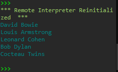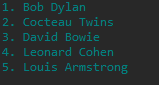 name_list = ['david bowie', 'louis armstrong', 'leonard cohen', 'bob dylan', 'cocteau twins'] a = sorted(name_list) i = 0 while i < len(a): print(f'{1 + i}.',a[i].title()) i += 1 print()
