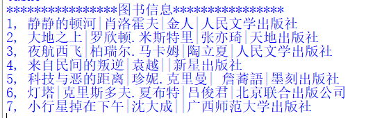book_list = [['静静的顿河','肖洛霍夫','金人', '人民文学出版社'], ['大地之上','罗欣顿.米斯特里','张亦琦', '天地出版社'], ['夜航西飞', '柏瑞尔.马卡姆', '陶立夏', '人民文学出版社'], ['来自民间的叛逆', '袁越', '','新星出版社'], ['科技与恶的距离', '珍妮.克里曼', ' 詹蕎語', '墨刻出版社'], ['灯塔','克里斯多夫.夏布特','吕俊君','北京联合出版公司'], ['小行星掉在下午','沈大成', '', '广西师范大学出版社']] print('{:*^36}'.format('图书信息')) i = 0 while i < len(book_list): x = book_list[i] print(f'{i+1},', '|'.join(x)) i += 1