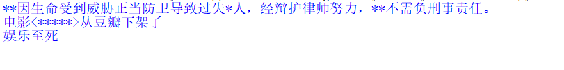 words_sensitive_list = ['张三', 'V字仇杀队', '杀'] comments_list = ['张三因生命受到威胁正当防卫导致过失杀人,经辩护律师努力,张三不需负刑事责任。','电影<V字仇杀队>从豆瓣下架了','娱乐至死'] for i in words_sensitive_list: for j in range(0,len(comments_list)): if i in comments_list[j]: comments_list[j] = comments_list[j].replace(i,'*'*len(i)) for line in comments_list: print(line)