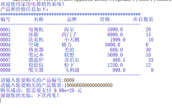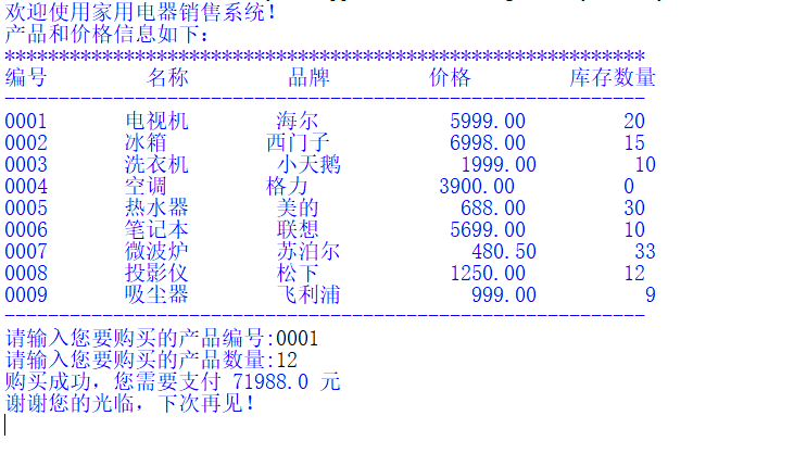 """ 家用电器销售系统 v1.1 """ #欢迎信息 print('欢迎使用家用电器销售系统!') #产品信息列表 print('产品和价格信息如下:') print('***********************************************************') print('%-10s'%'编号','%-10s'%'名称','%-10s'%'品牌','%-10s'%'价格','%-10s'%'库存数量') print('-----------------------------------------------------------') print('%-10s'%'0001','%-10s'%'电视机','%-10s'%'海尔','%10.2f'%5999.00,'%10d'%20) print('%-10s'%'0002','%-10s'%'冰箱','%-10s'%'西门子','%10.2f'%6998.00,'%10d'%15) print('%-10s'%'0003','%-10s'%'洗衣机','%-10s'%'小天鹅','%10.2f'%1999.00,'%10d'%10) print('%-10s'%'0004','%-10s'%'空调','%-10s'%'格力','%10.2f'%3900.00,'%10d'%0) print('%-10s'%'0005','%-10s'%'热水器','%-10s'%'美的','%10.2f'%688.00,'%10d'%30) print('%-10s'%'0006','%-10s'%'笔记本','%-10s'%'联想','%10.2f'%5699.00,'%10d'%10) print('%-10s'%'0007','%-10s'%'微波炉','%-10s'%'苏泊尔','%10.2f'%480.50,'%10d'%33) print('%-10s'%'0008','%-10s'%'投影仪','%-10s'%'松下','%10.2f'%1250.00,'%10d'%12) print('%-10s'%'0009','%-10s'%'吸尘器','%-10s'%'飞利浦','%10.2f'%999.00,'%10d'%9) print('-----------------------------------------------------------') #商品数据 products = [ ['0001','电视机','海尔',5999.00,20], ['0002','冰箱','西门子',6998.00,15], ['0003','洗衣机','小天鹅',1999.00,10], ['0004','空调','格力',3900.00,0], ['0005','热水器','美的',688.00,30], ['0006','笔记本','联想',5699.00,10], ['0007','微波炉','苏泊尔',480.50,33], ['0008','投影仪','松下',1250.00,12], ['0009','吸尘器','飞利浦',999.00,9] ] #用户输入信息 product_id = input('请输入您要购买的产品编号:') count = int(input('请输入您要购买的产品数量:')) #获取编号对应商品的信息 product_index = int(product_id) - 1 product = products[product_index] #计算金额 print('购买成功,您需要支付',product[3]*count,'元') #退出系统 print('谢谢您的光临,下次再见!')