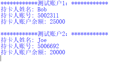 class Account: def __init__(self, name, account_number, initial_amount = 10): self._name = name self._card_no = account_number self._balance = initial_amount def deposit(self, amount): self._balance += amount def withdraw(self, amount): if self._balance < amount: print('余额不足') return self._balance -= amount def info(self): print('持卡人姓名:', self._name) print('持卡人账号:', self._card_no) print('持卡人账户余额:', self._balance) def get_balance(self): return self._balance def main(): print('测试账户1:'.center(30, '*')) a1 = Account('Bob', '5002311', 20000) a1.deposit(5000) a1.withdraw(4000) a1.info() print() print('测试账户2:'.center(30, '*')) a2 = Account('Joe', '5006692', 20000) a2.withdraw(10000) a2.withdraw(5000) a2.info() if __name__ == '__main__': main()
