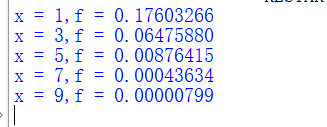 from math import * def func(x): m = 0 s = 2 fst = 1/(((2*pi)**0.5)*s) sed = exp((-0.5)*((x-m)/s)**2) return fst*sed print(f'x = 1,f = {func(1):.8f}') print(f'x = 3,f = {func(3):.8f}') print(f'x = 5,f = {func(5):.8f}') print(f'x = 7,f = {func(7):.8f}') print(f'x = 9,f = {func(9):.8f}')