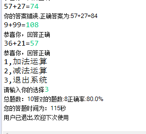 做一个1~6年纪的小学生口算题卡的程序,可以自动生成每组10道100以内的加减乘除题,在学生给出题的答案后,系统则会判断对错,并给予正确的答案。在结束后统计用时和正确率。