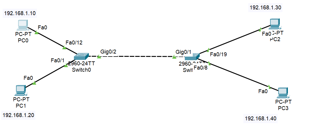Switch>en Switch# Switch#conf t Switch(config)#vlan 10 Switch(config-vlan)#vlan 20 Switch(config-vlan)#exit Switch#sh vl br Switch#sh vl br VLAN Name Status Ports ---- -------------------------------- --------- ------------------------------- 1 default active Fa0/1, Fa0/2, Fa0/3, Fa0/4 Fa0/5, Fa0/6, Fa0/7, Fa0/8 Fa0/9, Fa0/10, Fa0/11, Fa0/12 Fa0/13, Fa0/14, Fa0/15, Fa0/16 Fa0/17, Fa0/18, Fa0/19, Fa0/20 Fa0/21, Fa0/22, Fa0/23, Fa0/24 Gig0/1, Gig0/2 10 VLAN0010 active 20 VLAN0020 active 1002 fddi-default active 1003 token-ring-default active 1004 fddinet-default active 1005 trnet-default active Switch(config)#int range f0/1-10 Switch(config-if-range)#switchport mode access Switch(config-if-range)#switchport access vlan 10 Switch(config-if-range)#end Switch(config)#int range f0/11-20 Switch(config-if-range)#switchport mode access Switch(config-if-range)#switchport access vlan 20 Switch(config-if-range)#end Switch#sh vl br VLAN Name Status Ports ---- -------------------------------- --------- ------------------------------- 1 default active Fa0/21, Fa0/22, Fa0/23, Fa0/24 Gig0/1, Gig0/2 10 VLAN0010 active Fa0/1, Fa0/2, Fa0/3, Fa0/4 Fa0/5, Fa0/6, Fa0/7, Fa0/8 Fa0/9, Fa0/10 20 VLAN0020 active Fa0/11, Fa0/12, Fa0/13, Fa0/14 Fa0/15, Fa0/16, Fa0/17, Fa0/18 Fa0/19, Fa0/20 1002 fddi-default active 1003 token-ring-default active 1004 fddinet-default active 1005 trnet-default active