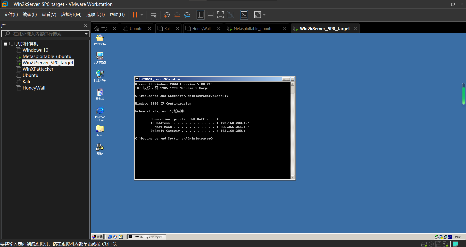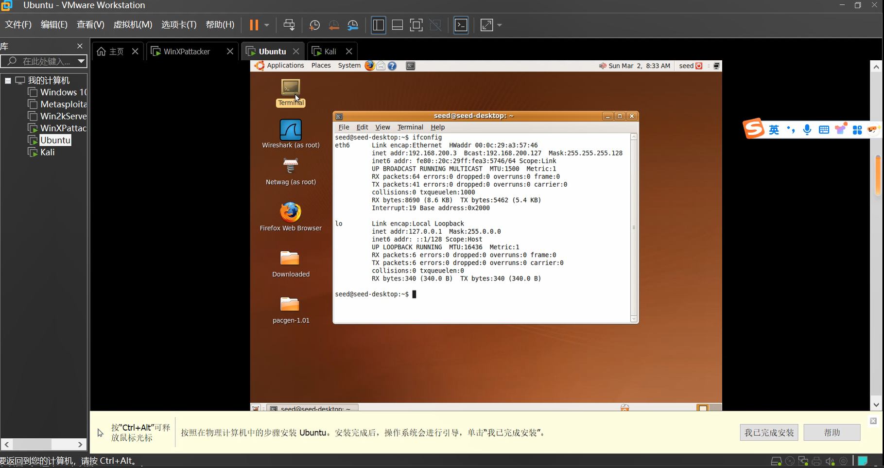 利用提供的虚拟机镜像和VMWare Workstations软件,在自己的笔记本电脑或者P上部署一套个人版网络攻防实践环境,至少包括一台攻击机、一台靶机、SEED虚拟机和蜜网网关,并进行网络连通性测试,确保各个虚拟机能够正常联通。撰写详细实验报告,细致说明安装和配置过程(截图)、过程说明、发现问题和解决问题过程,以及最后测试结果。