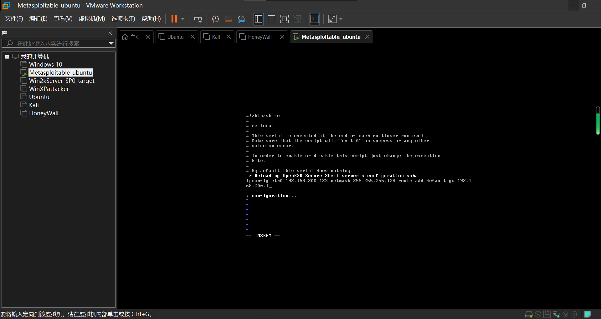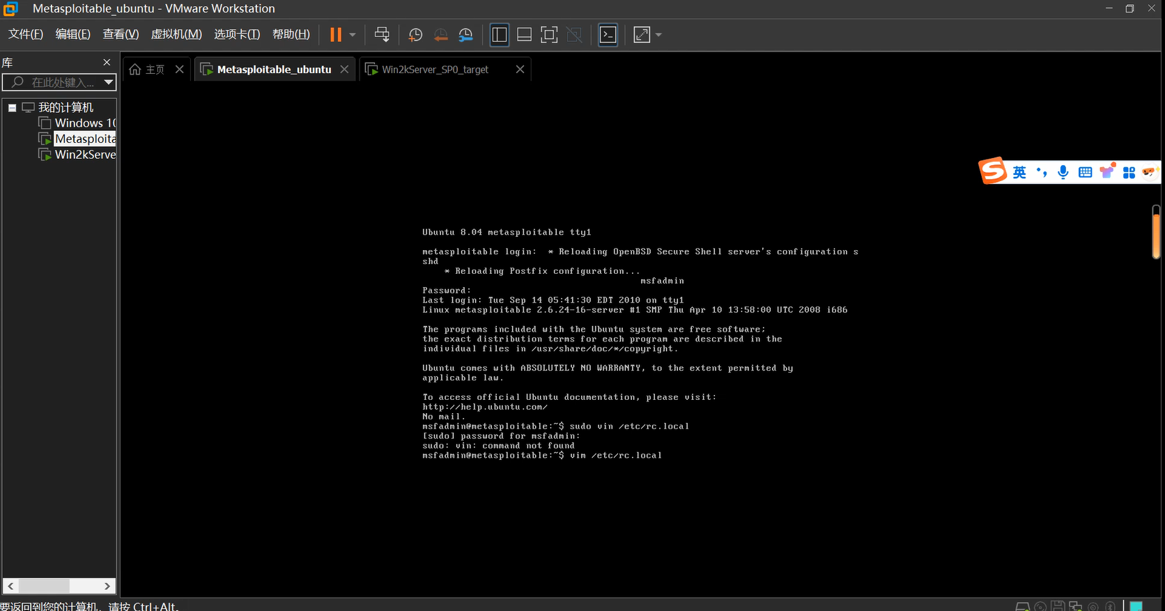 首先打开Metasploitable虚拟机,并且输入对应的用户名和密码,再输入sudo vim /etc/rc.local来进行修改