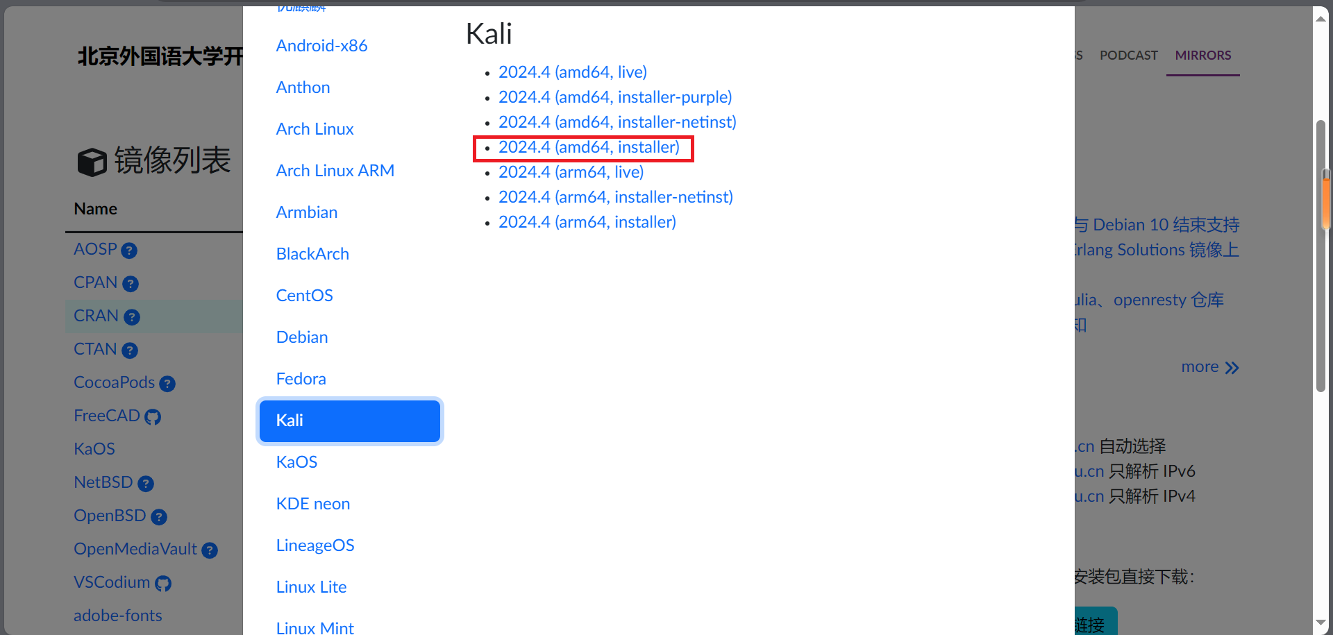 可以从北京外国语大学开源软件镜像站 | BFSU Open Source Mirror上下载Kali的镜像。