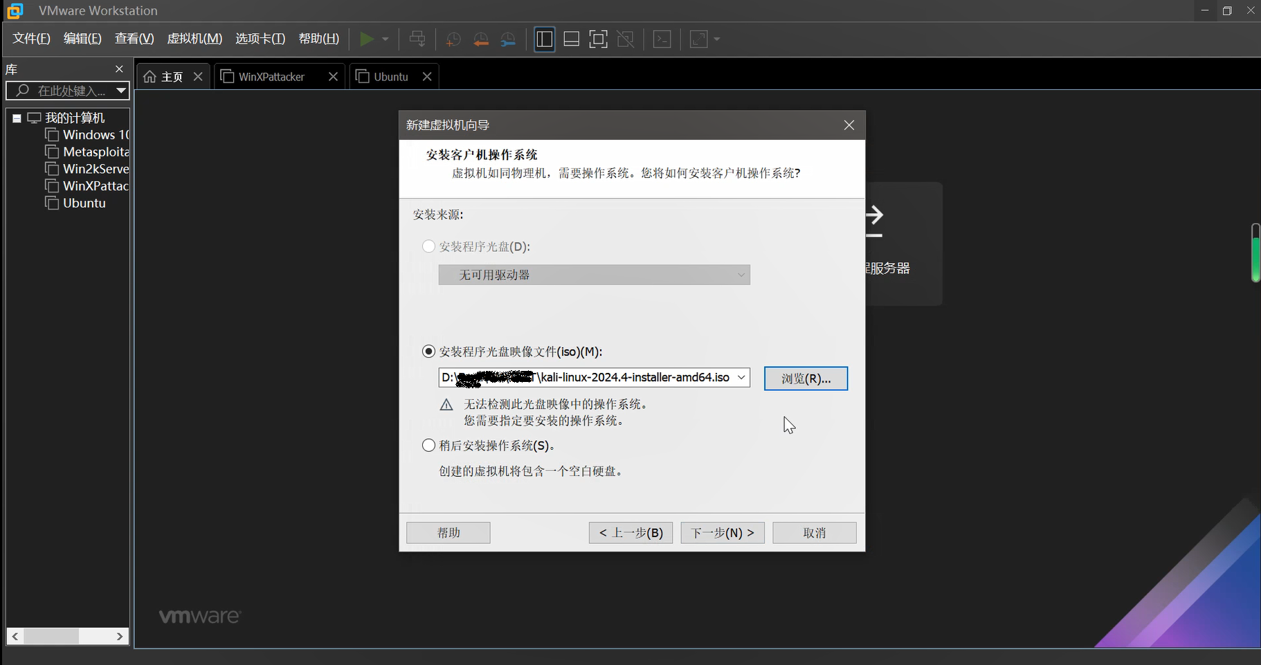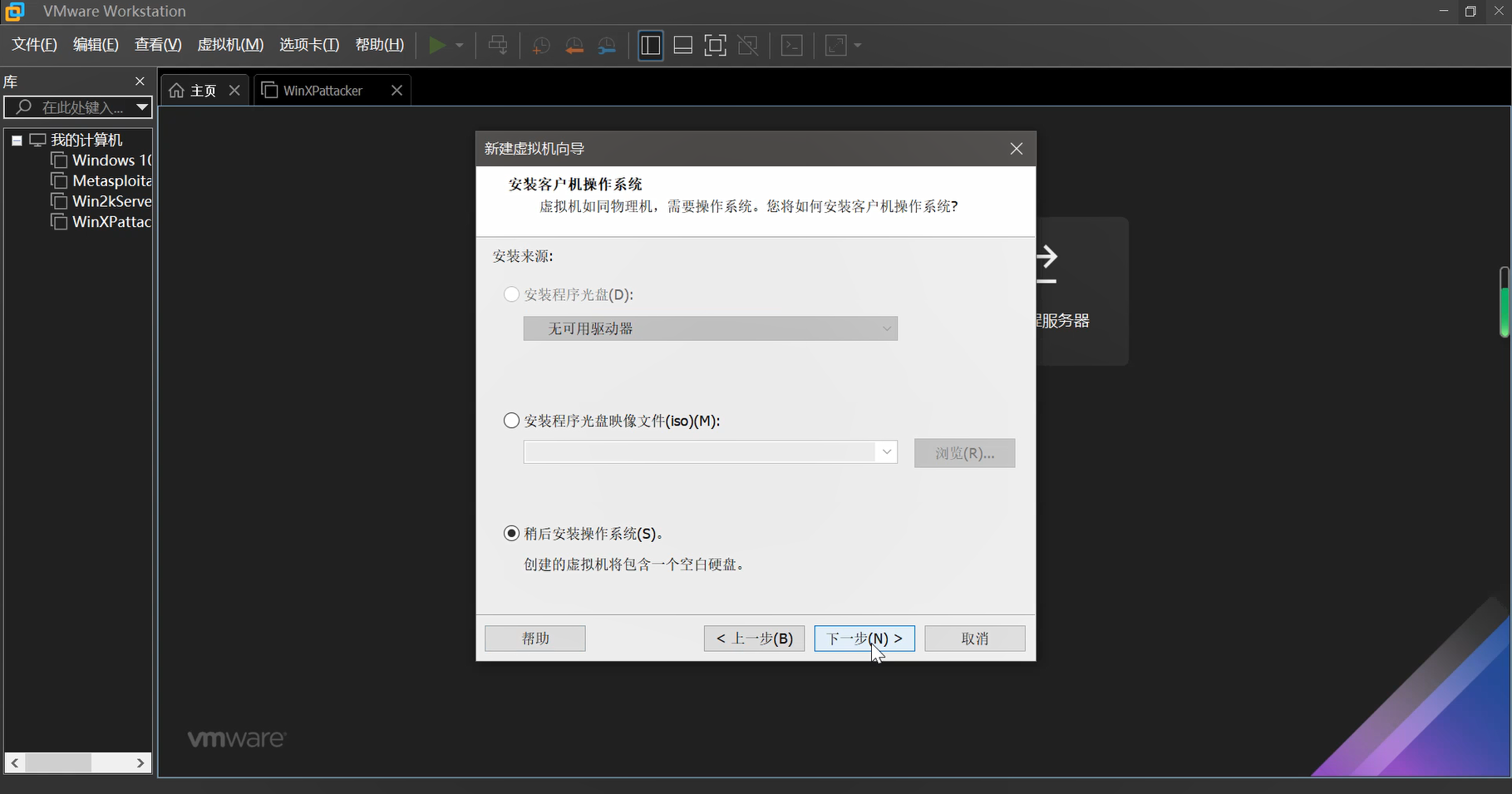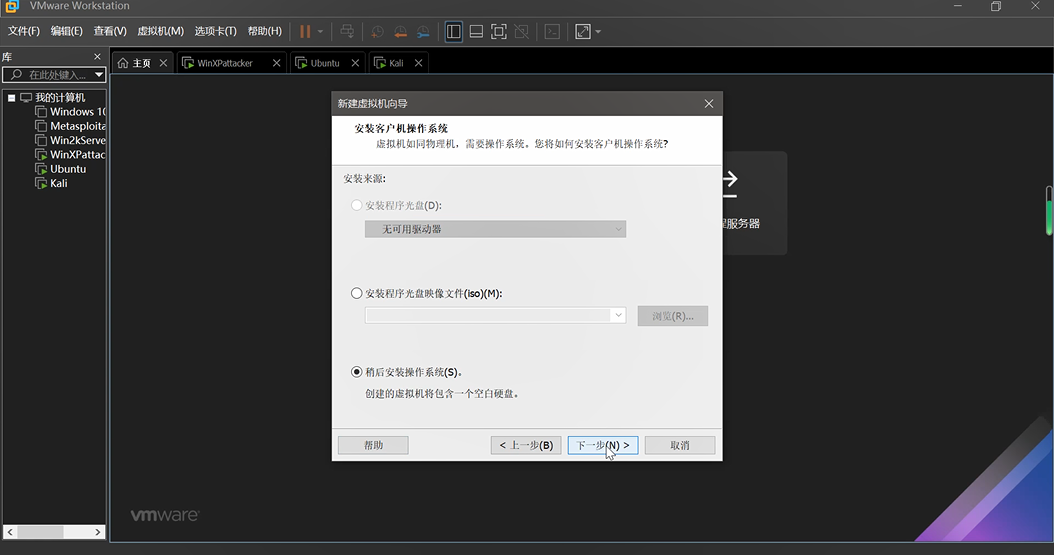 选择新建虚拟机,与kali不同的是,选择稍后再安装系统