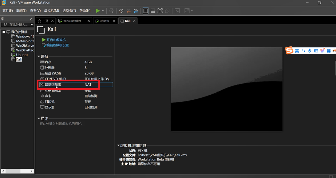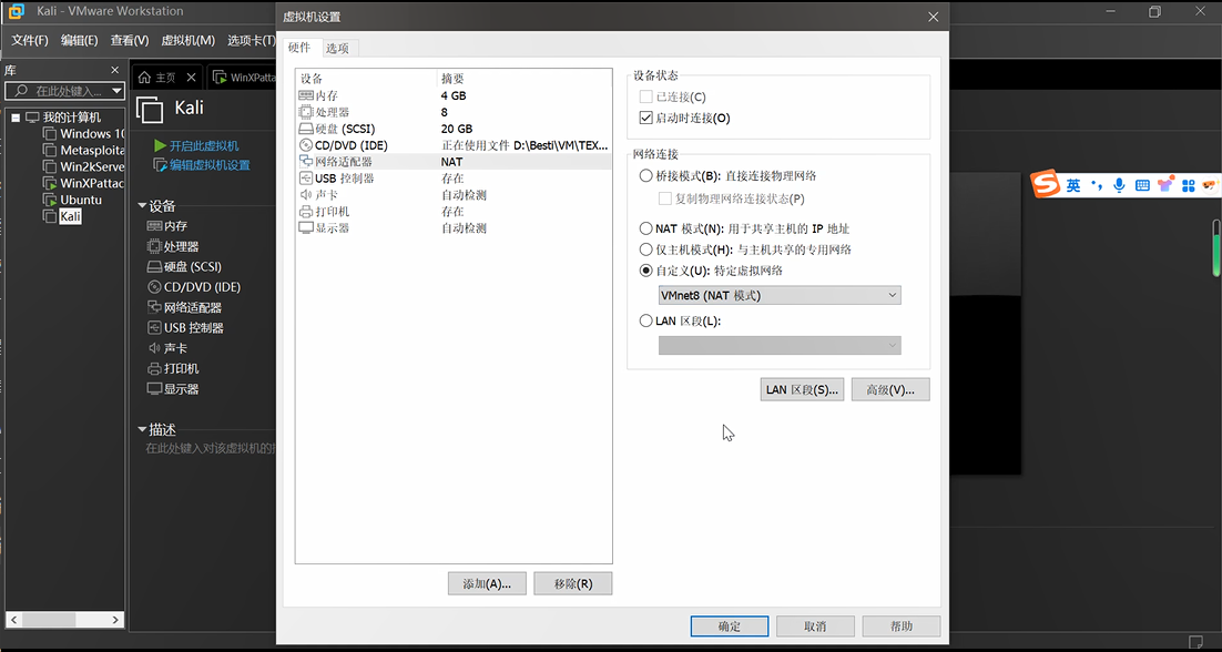 在网络适配器中选择自定义,并且选择“VMnet8(NAT模式)” (当安装另外两个攻击机时,也进行同样的操作,后边就不再展示了)