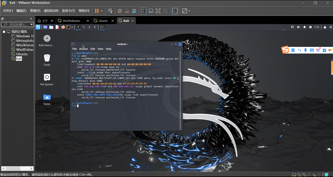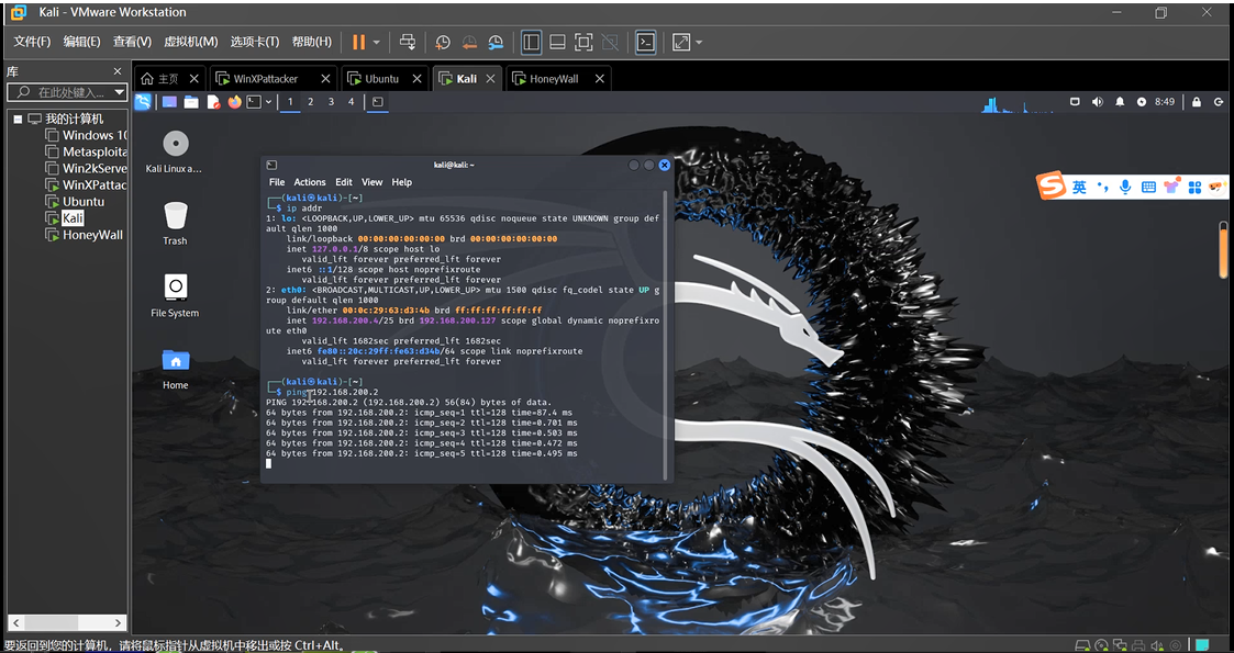 我们可以用Kali来PING一下虚拟机。我们在Kali输入ping 192.168.200.2
