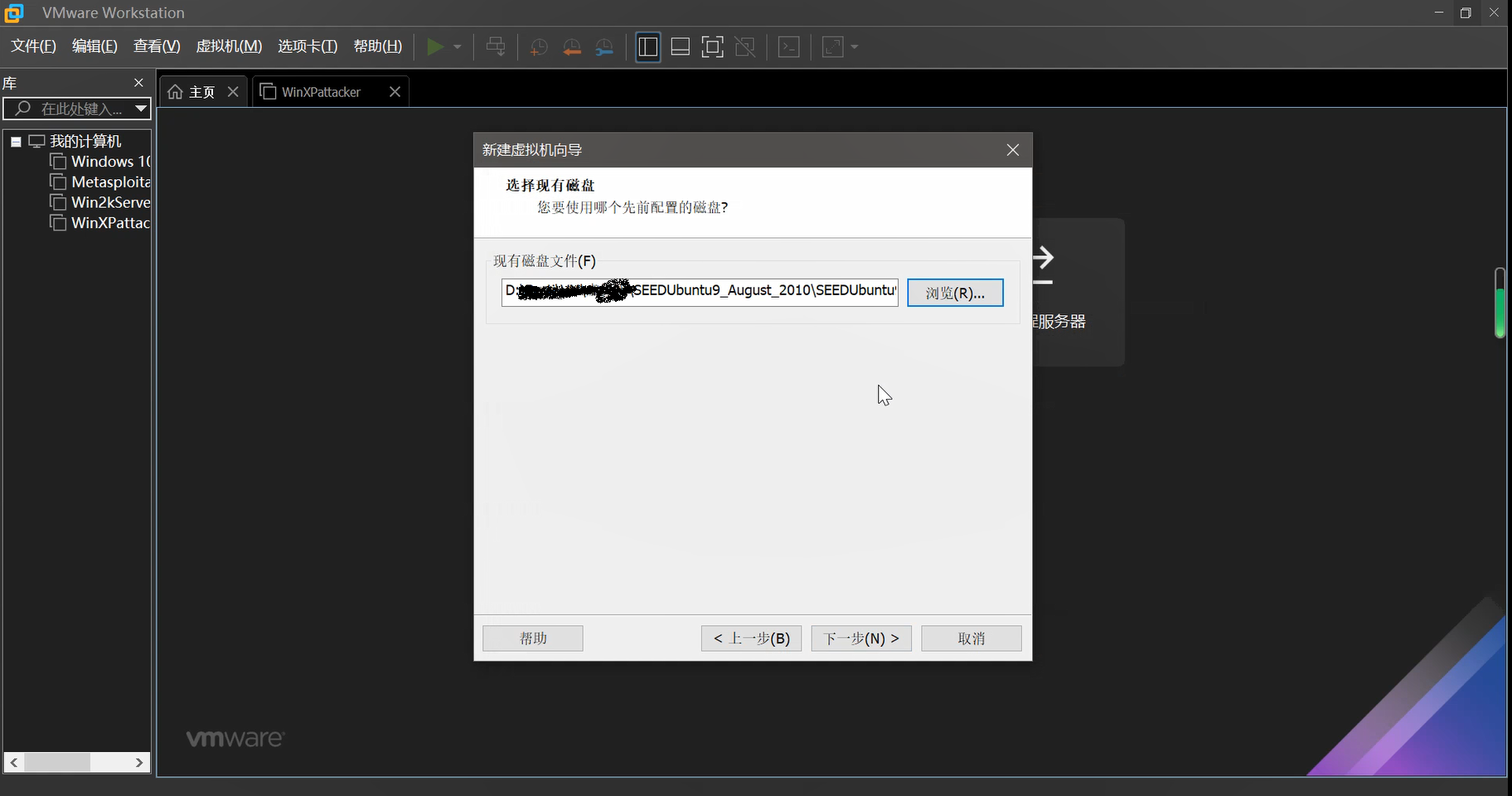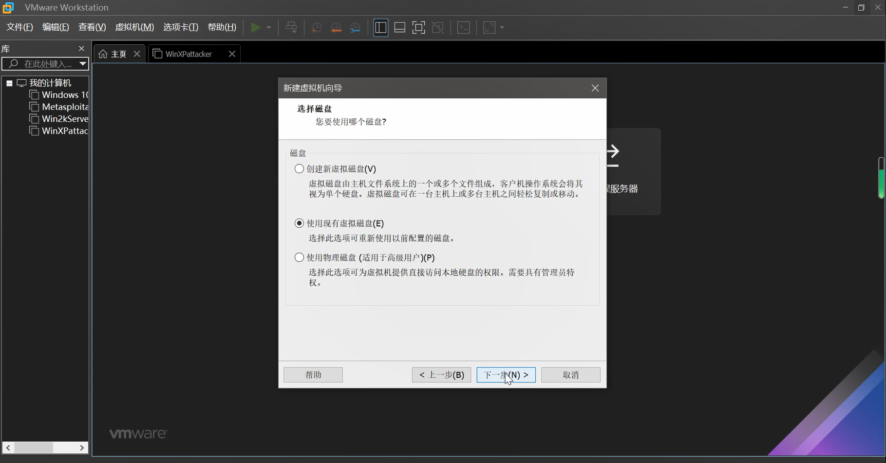 之后操作基本都是点击默认选项,但是与kali的不同的是,这里选择“使用现有虚拟磁盘”。