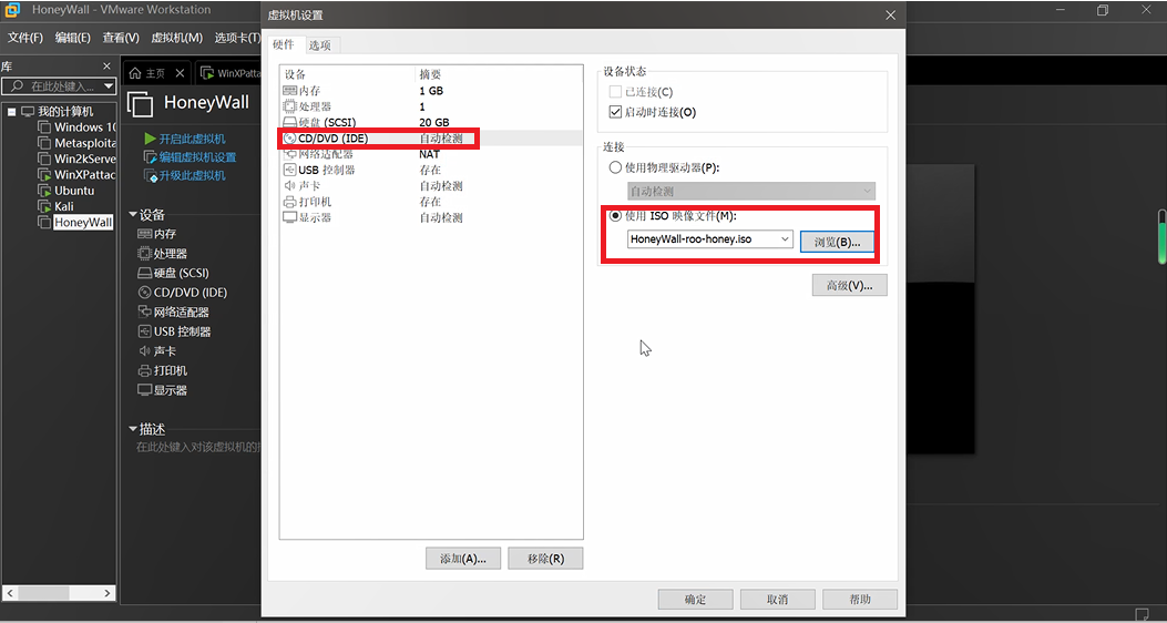 点击CD/DVD,选择使用ISO映像文件,找到我们的蜜网文件