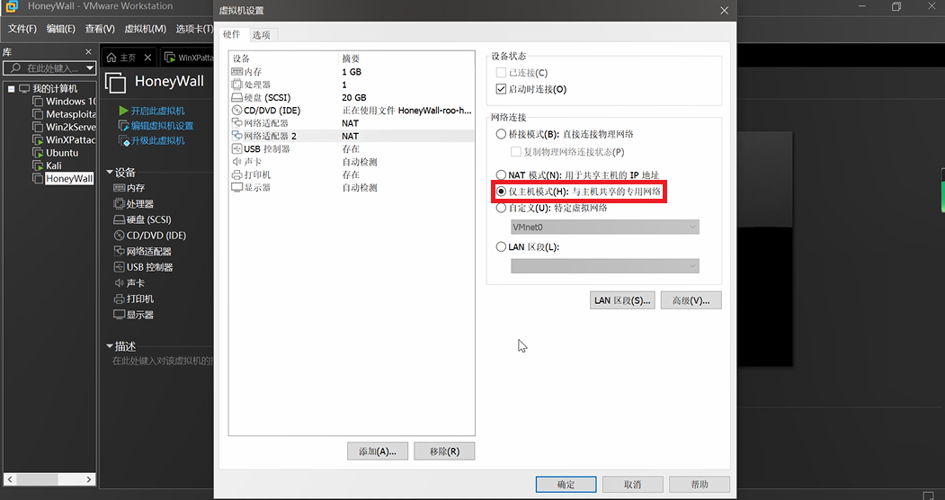 我们新添加的这个网络适配器,需要选择仅主机模式