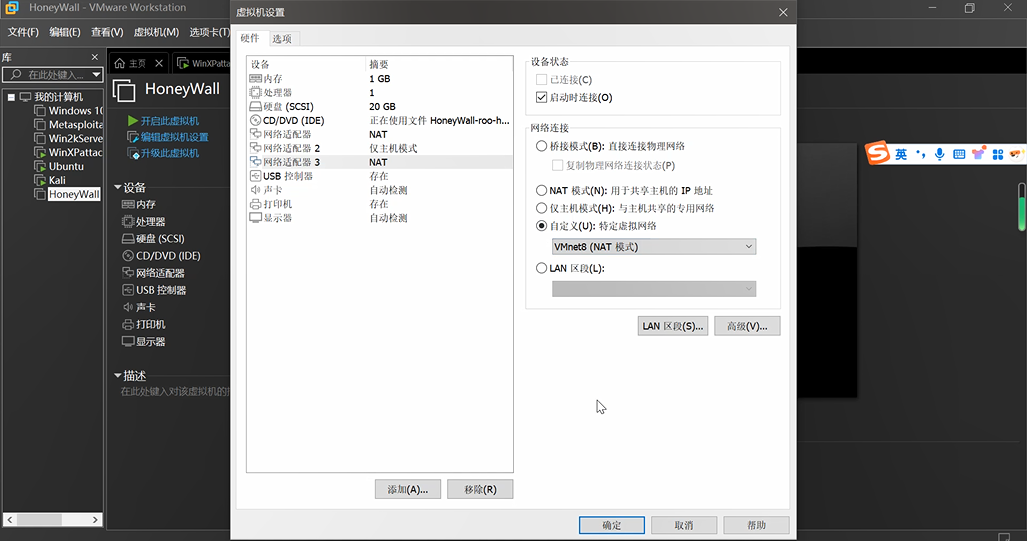 我们需要再添加一个网络适配器,选择自定义VMnet8(NAT模式),用来连接攻击机网段。