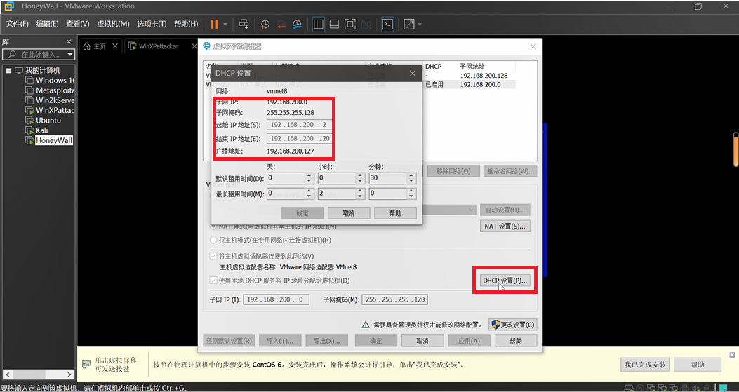 但是我们的广播地址要写多少呢,我们需要进入网络编辑器来查一下。点击VM左上角的编辑,选项虚拟网络编辑器。因为我们的蜜网网关是NAT模式的,所以我们点击我们的VMnet8,点击DHCP设置,我们需要把这些地址都记住,方便后面进行配置。所以我们的广播地址写192.168.200.127,之后保存。
