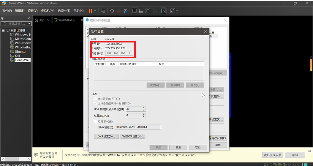 我们继续配置IP地址,去配置蜜网网段,刚才我们查到子网IP是192.168.200.0,子网掩码是128,所以这里是192.168.200.0/25