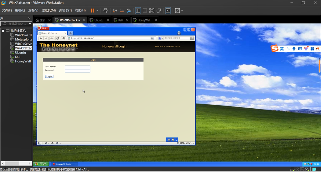 我们可以点开我们的WinXP虚拟机点击一个浏览器,输入https://刚才蜜网网关的IP地址,就会进入下方这个页面,说明成功啦!再登录进去,修改好密码。