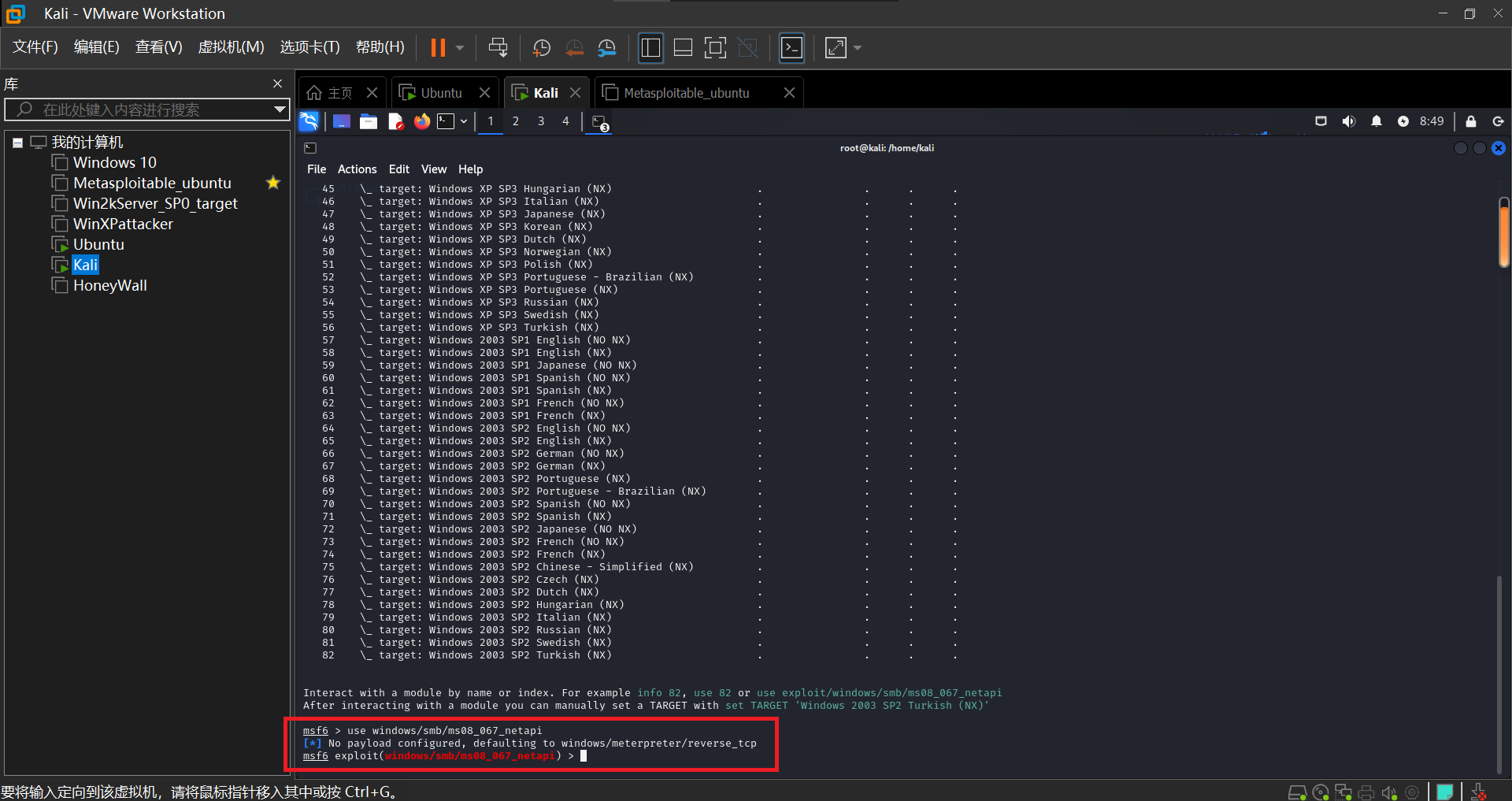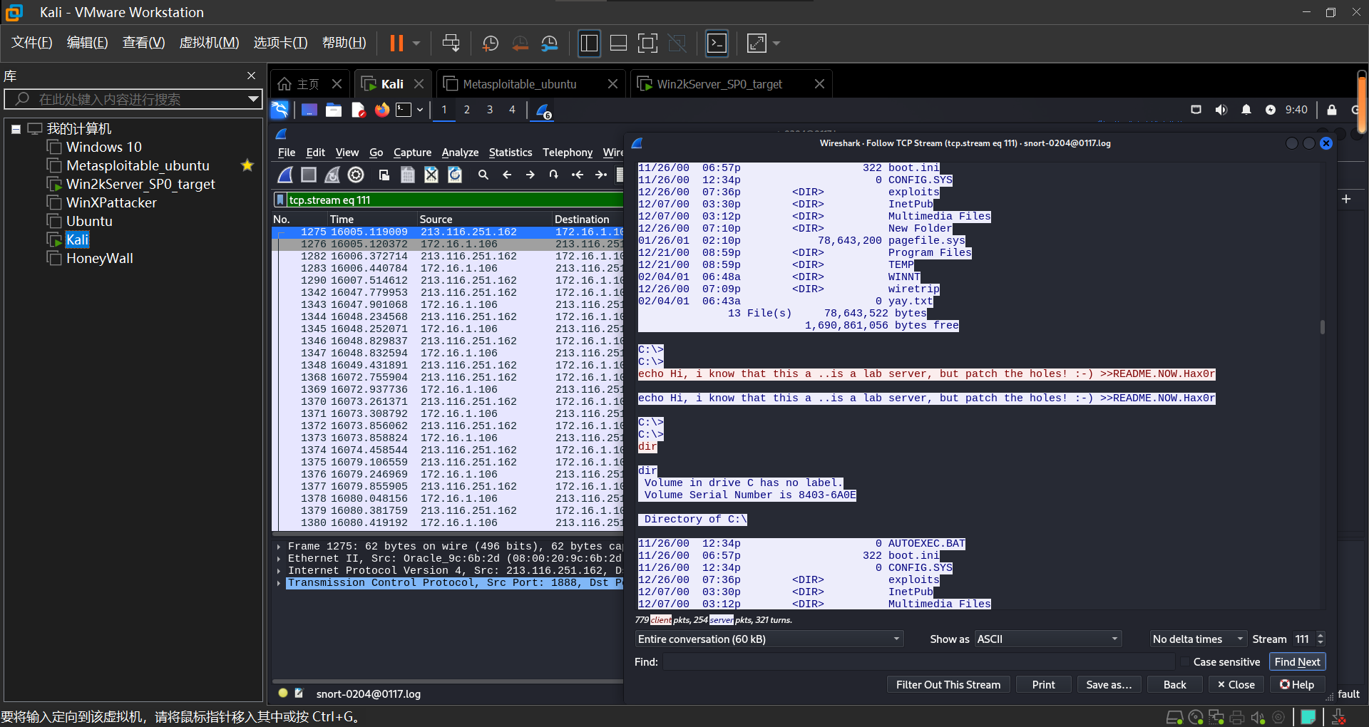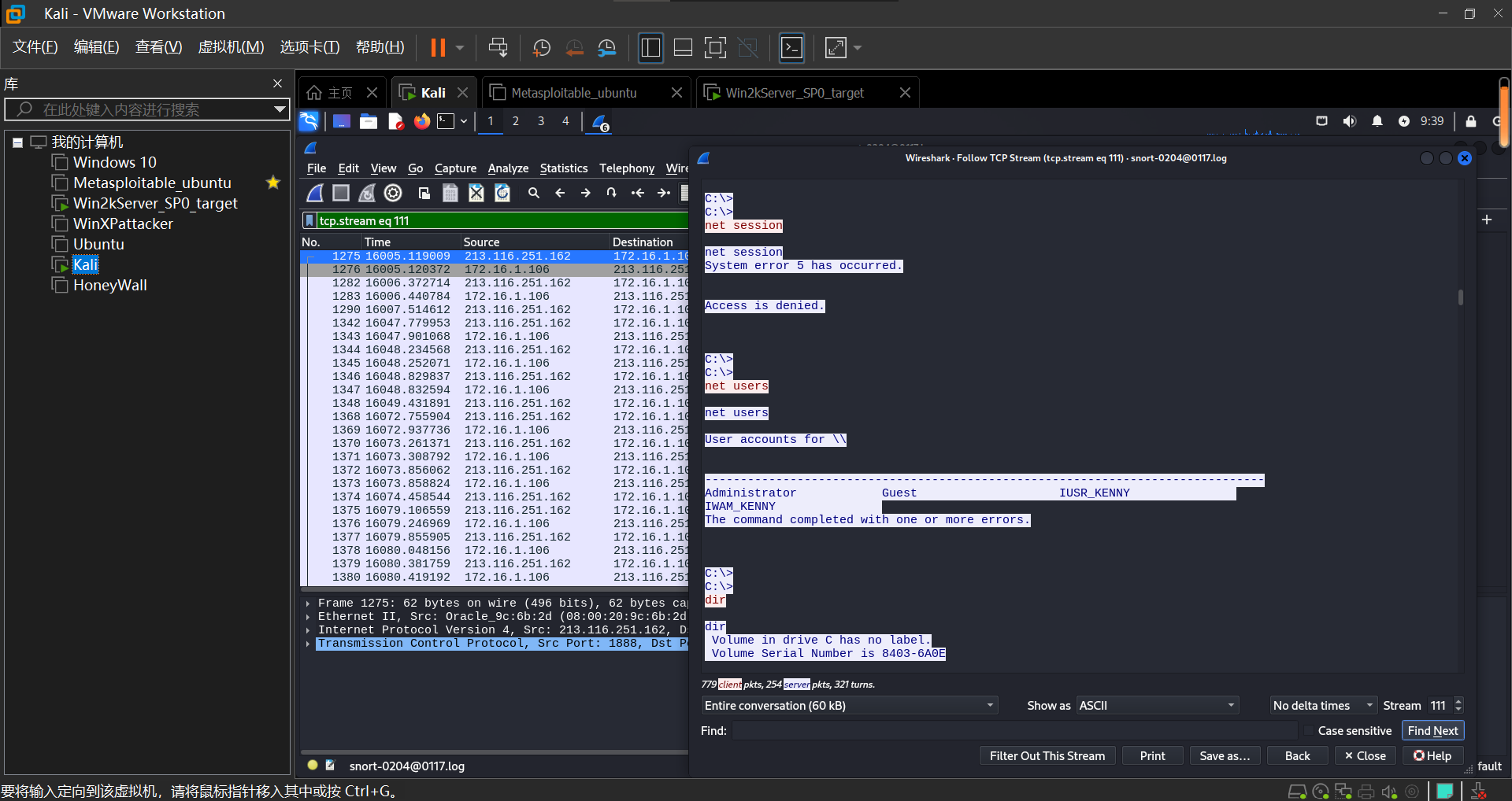 设置进行渗透攻击的主机为Kali,受到攻击的主机为Win2kServer