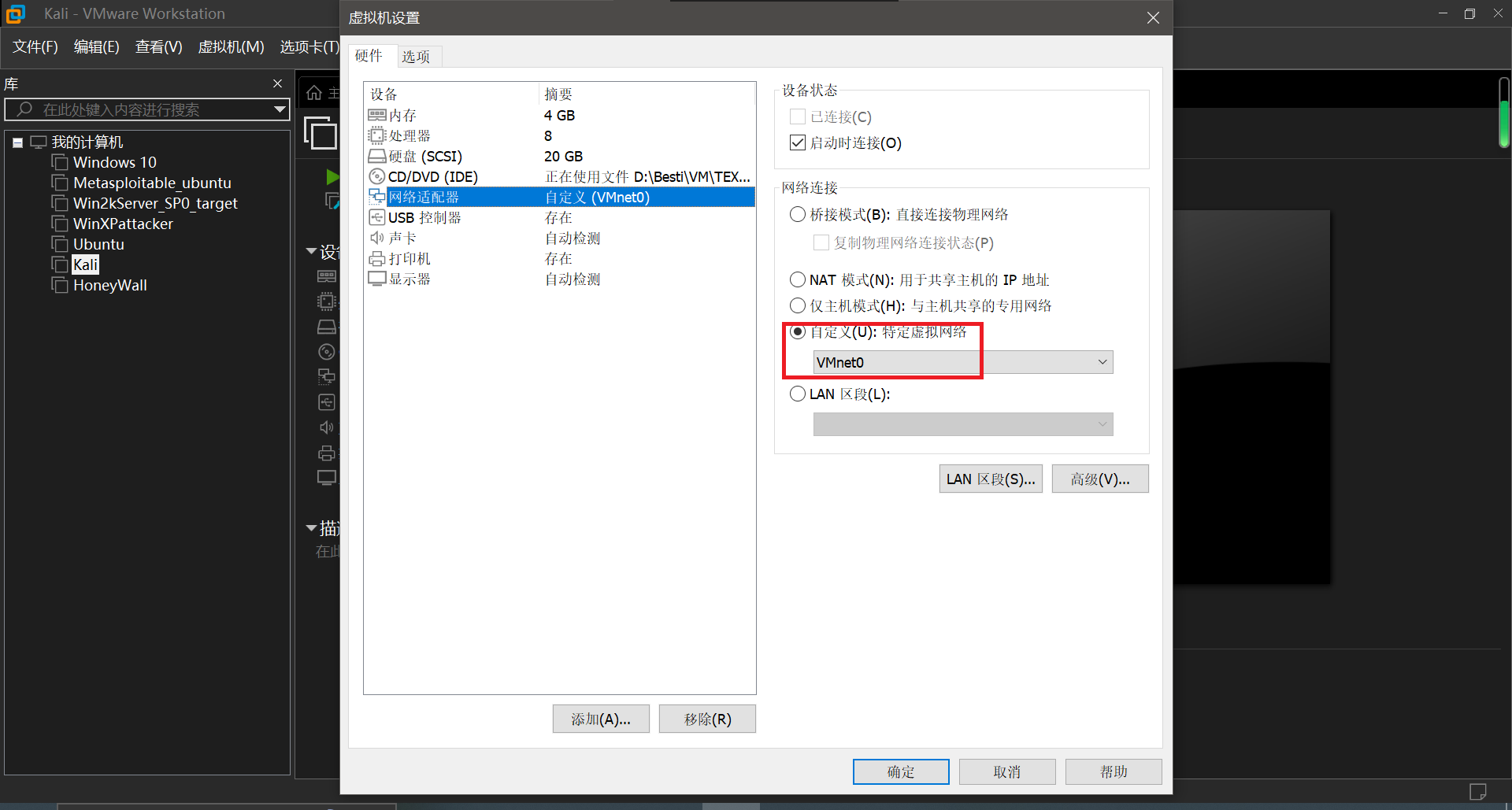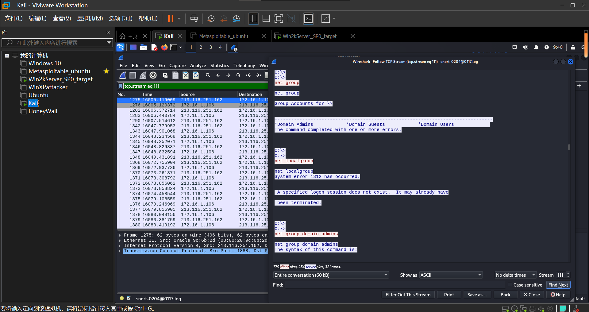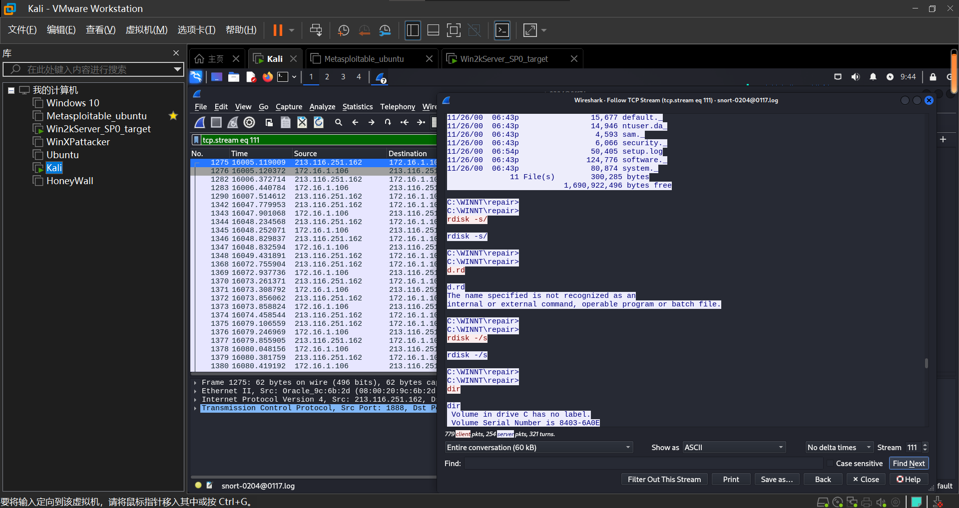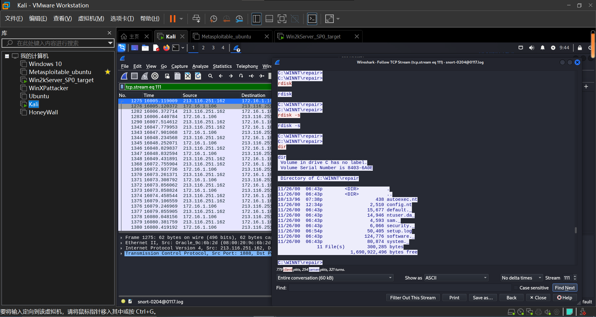 设置进行渗透攻击的主机为Kali,受到攻击的主机为Win2kServer